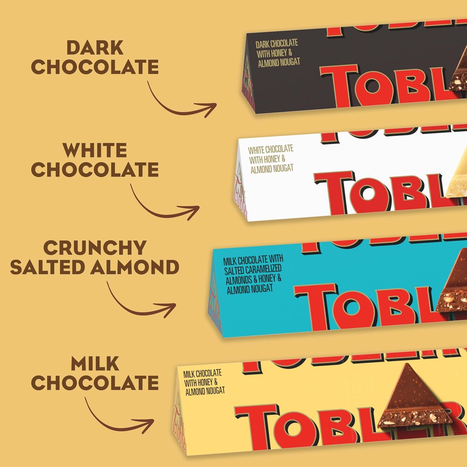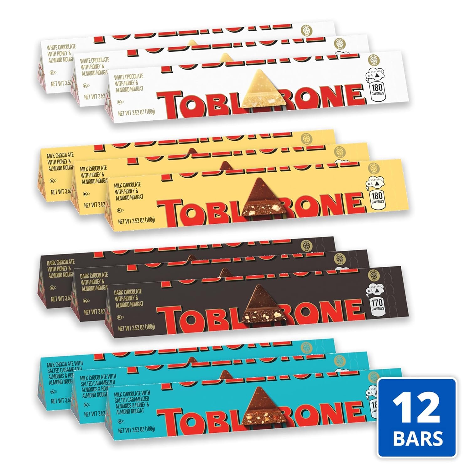 TOBLERONE Assorted Chocolate Bars Variety Pack (Milk, Dark, White, & Salted Caramelized Almonds), Valentines Day Chocolate Candy, 12 – 3.52 oz Bars