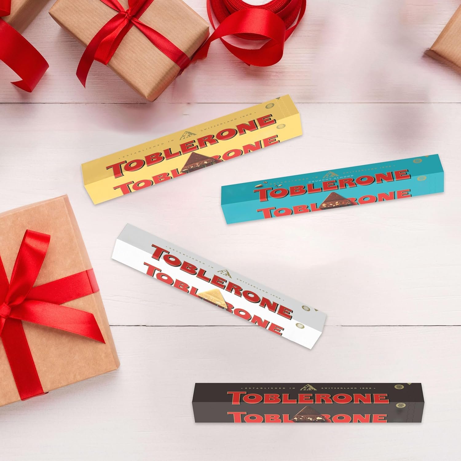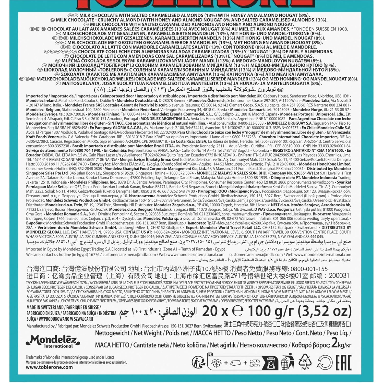 Each milk chocolate bar is filled with crunchy salted caramelized almonds and TOBLERONE’s signature honey and almond nougat