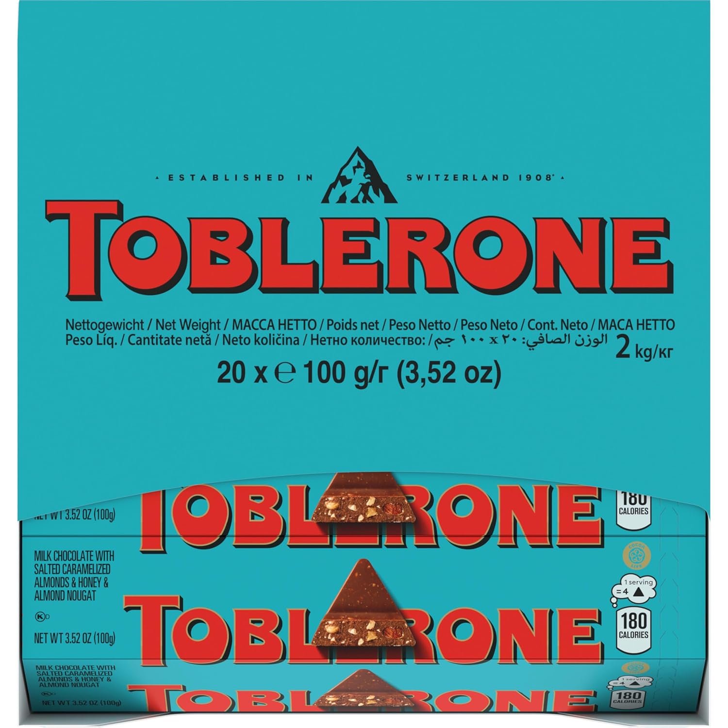 Twenty 3.52 oz TOBLERONE Milk Chocolate Bars with Salted Caramelized Almonds (packaging may vary)