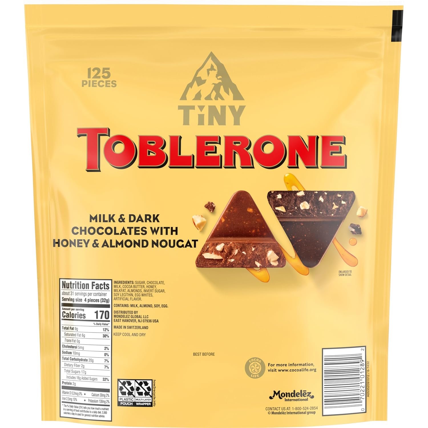 TOBLERONE Tiny Assorted Chocolate Bars feature iconic and unmistakable triangular chocolate peaks and a distinctive taste that’s been loved for over 100 years. Known for its heritage in Swiss chocolate making, the TOBLERONE brand crafts its chocolate bars with high-quality ingredients to satisfy the tastes of any chocolate lover. Each pack comes with milk and dark chocolate mixed with honey and almond nougat that creates delightfully decadent mini gourmet chocolate bars. Ideal for gifting and sharing, these mini chocolate candy bars are great for Easter, Valentine’s Day, Halloween, Christmas, and other celebrations for chocolate-loving friends, family and coworkers. Keep a stash of these European chocolate bars in your office for a sweet snack or crumble as a topping on your favorite desserts.