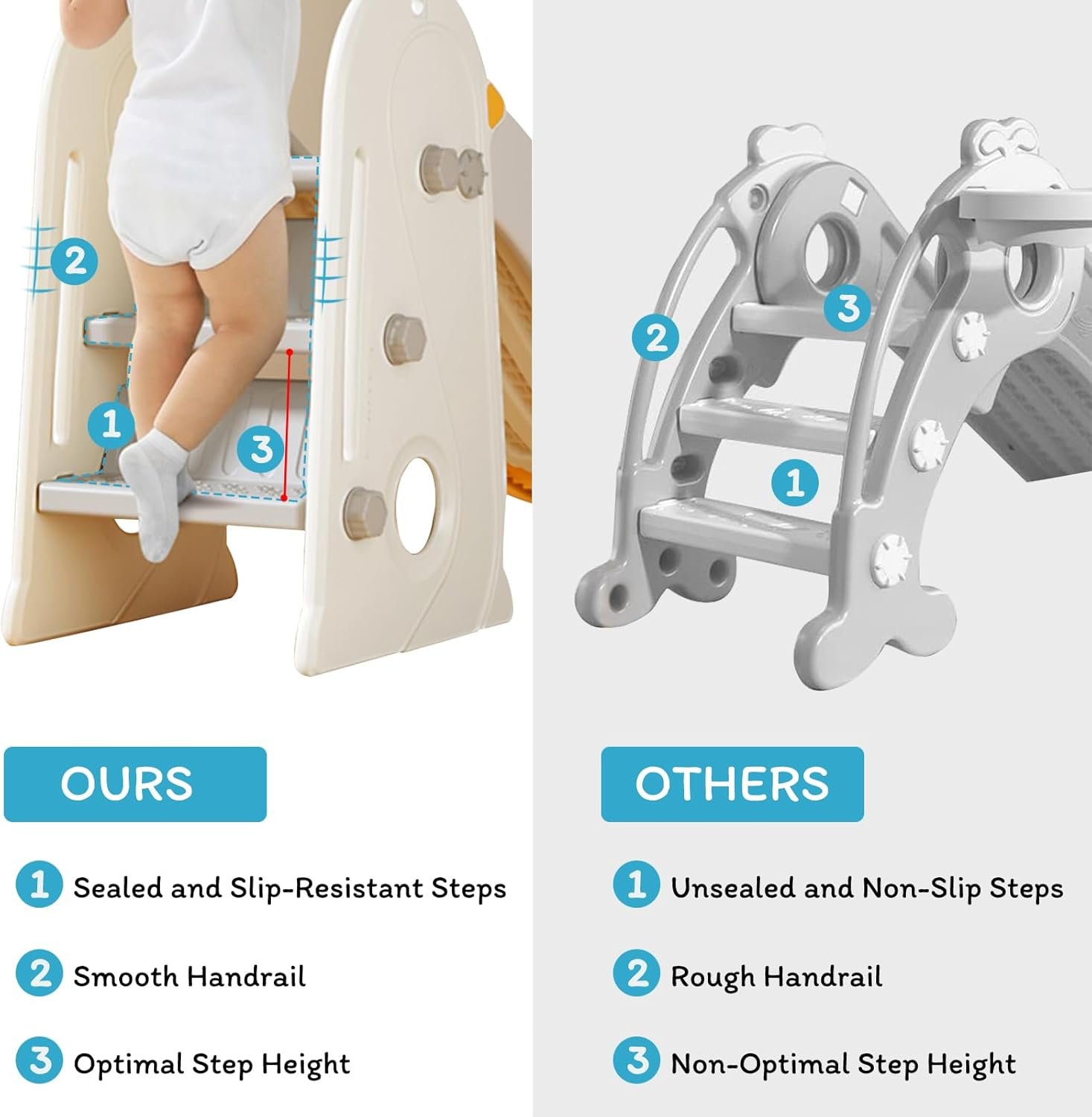 【Safe Adventures】Safety is paramount. Made of high-density polyethylene (HDPE), our indoor slide for toddlers has passed CPC and CPSC tests, ensuring it’s safe. Feel at ease and watch your child play freely.