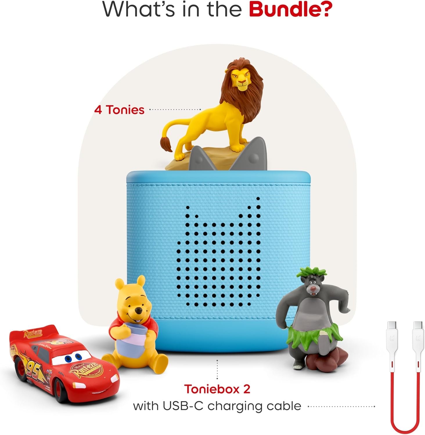 Bundle includes a Sky Blue Toniebox 2, 8.6” [22cm] USB-C charging cable, and Lightning McQueen, Simba, Winnie the Pooh, and Baloo Tonie Figurines. Power Adapter, longer charger cable, and additional Tonies sold separately. Wi-Fi needed for initial set-up. The USB-C Charging Cable is 8.6″ to meet child safety standards for little listeners aged 1+.