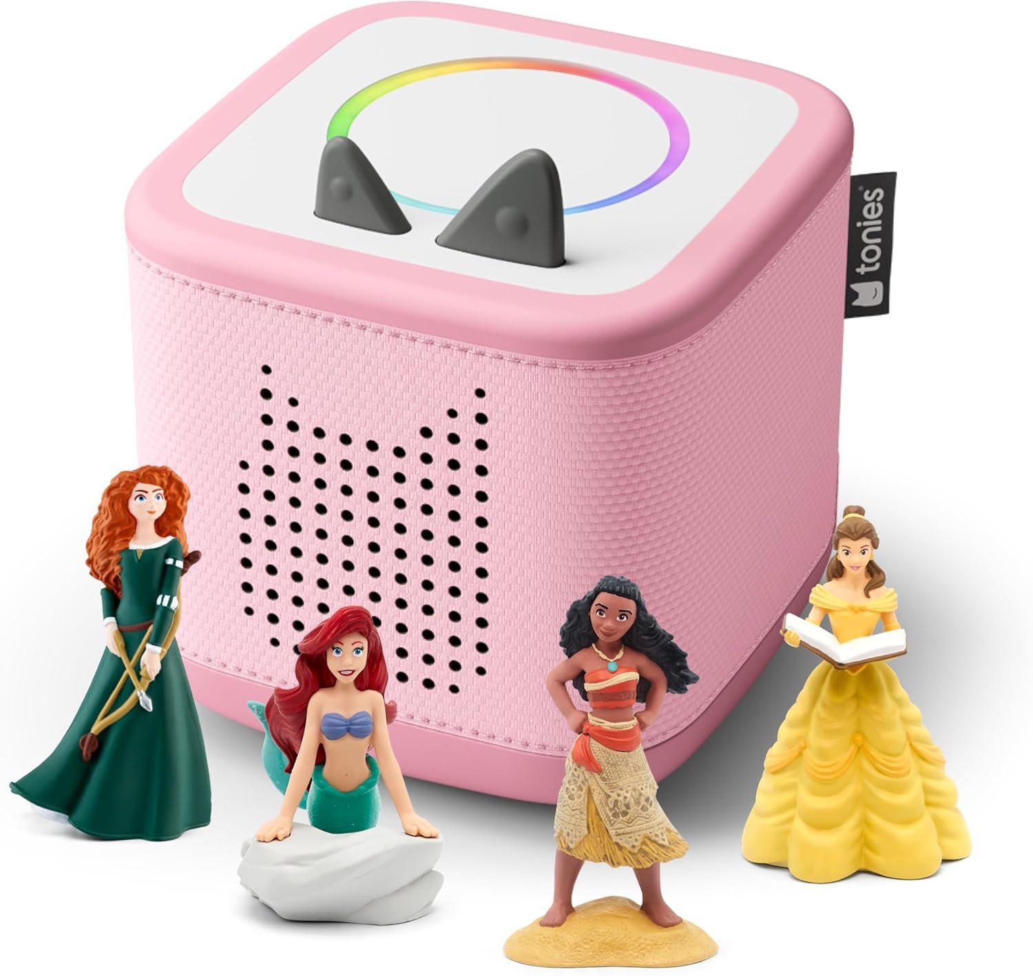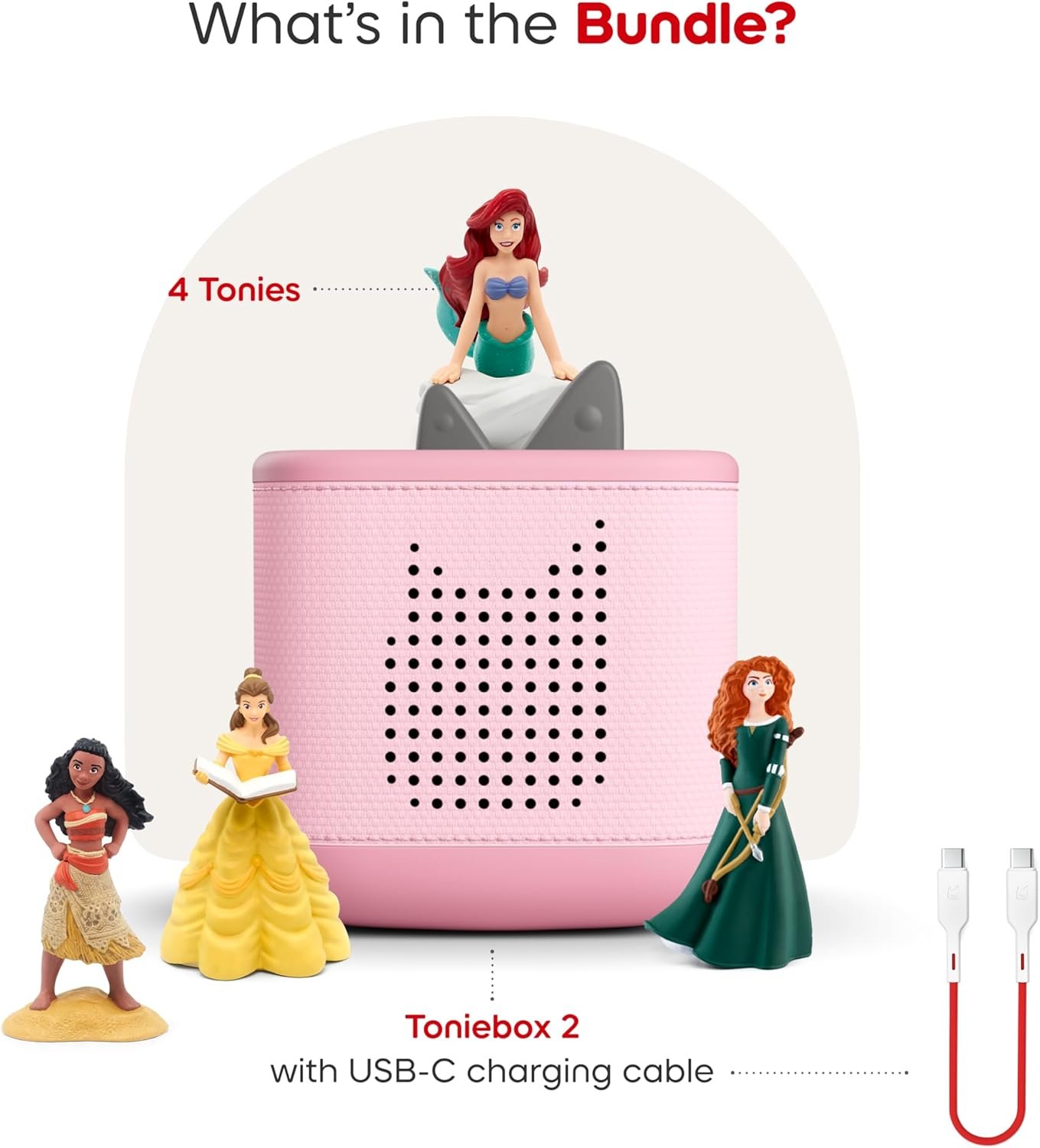 Bundle includes a Cloud Pink Toniebox 2, 8.6” [22cm] USB-C charging cable, and Moana, Ariel, Merida, and Belle Tonie Figurines. Power Adapter, longer charger cable, and additional Tonies sold separately. Wi-Fi needed for initial set-up. The USB-C Charging Cable is 8.6″ to meet child safety standards for little listeners aged 1+.