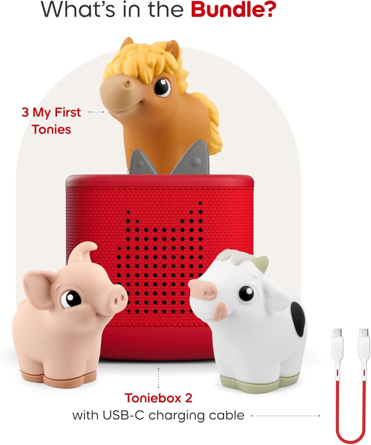 Bundle includes a Sunset Red Toniebox 2, 8.6” [22cm] USB-C charging cable, Cow, Horse, and Pig Tonies. Power Adapter, longer charger cable, and additional Tonies sold separately. Wi-Fi needed for initial set-up. The USB-C Charging Cable is 8.6″ to meet child safety standards for little listeners aged 1+.
