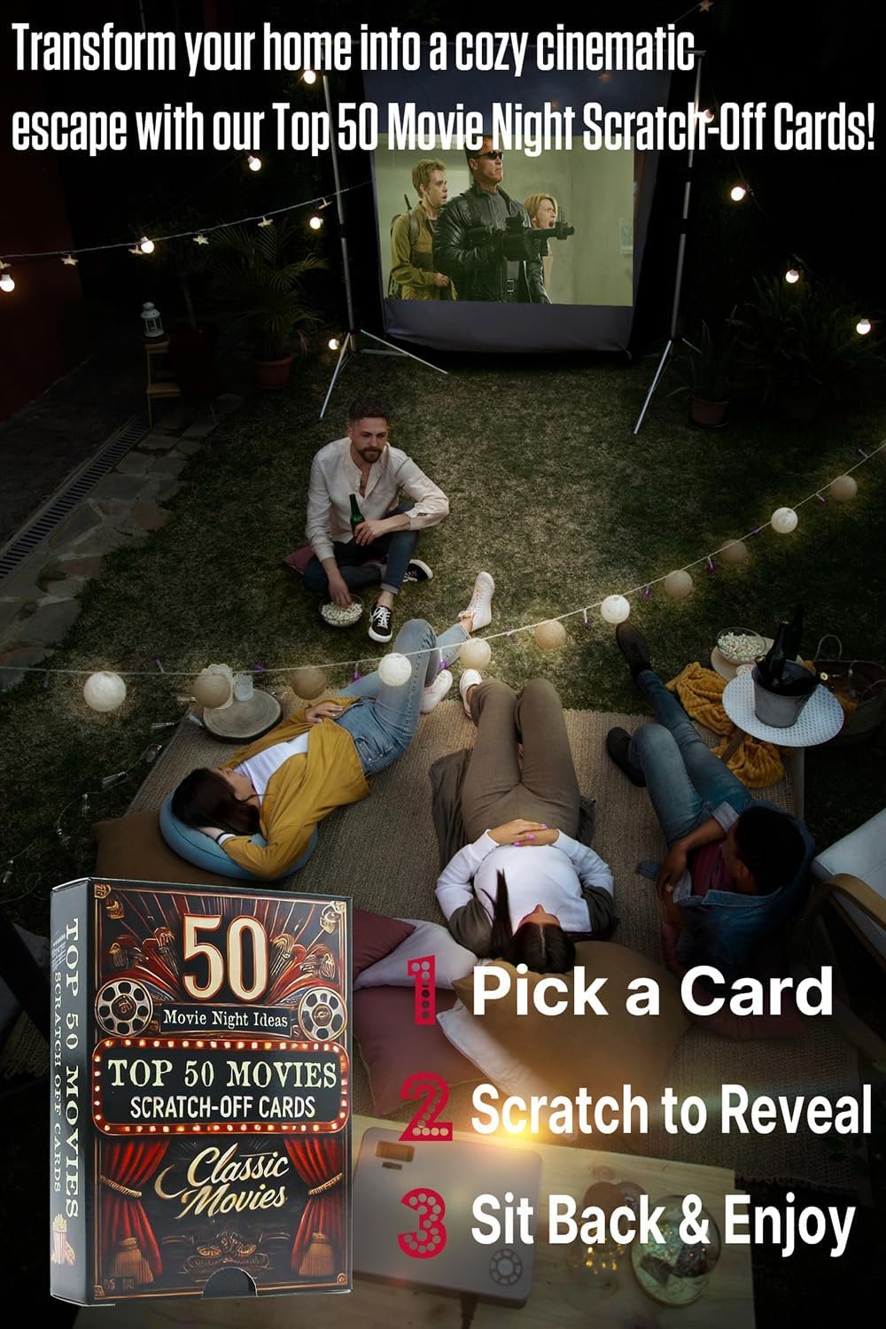 🎬 Experience Movie Magic Like Never Before: Turn your movie nights into an exciting cinematic adventure! With 50 handpicked films, this scratch-off movie deck challenges you to watch whatever you reveal—no takebacks! Use the Genre, Year and Length hints before scratching to build anticipation, then sit back and enjoy an unforgettable film journey.