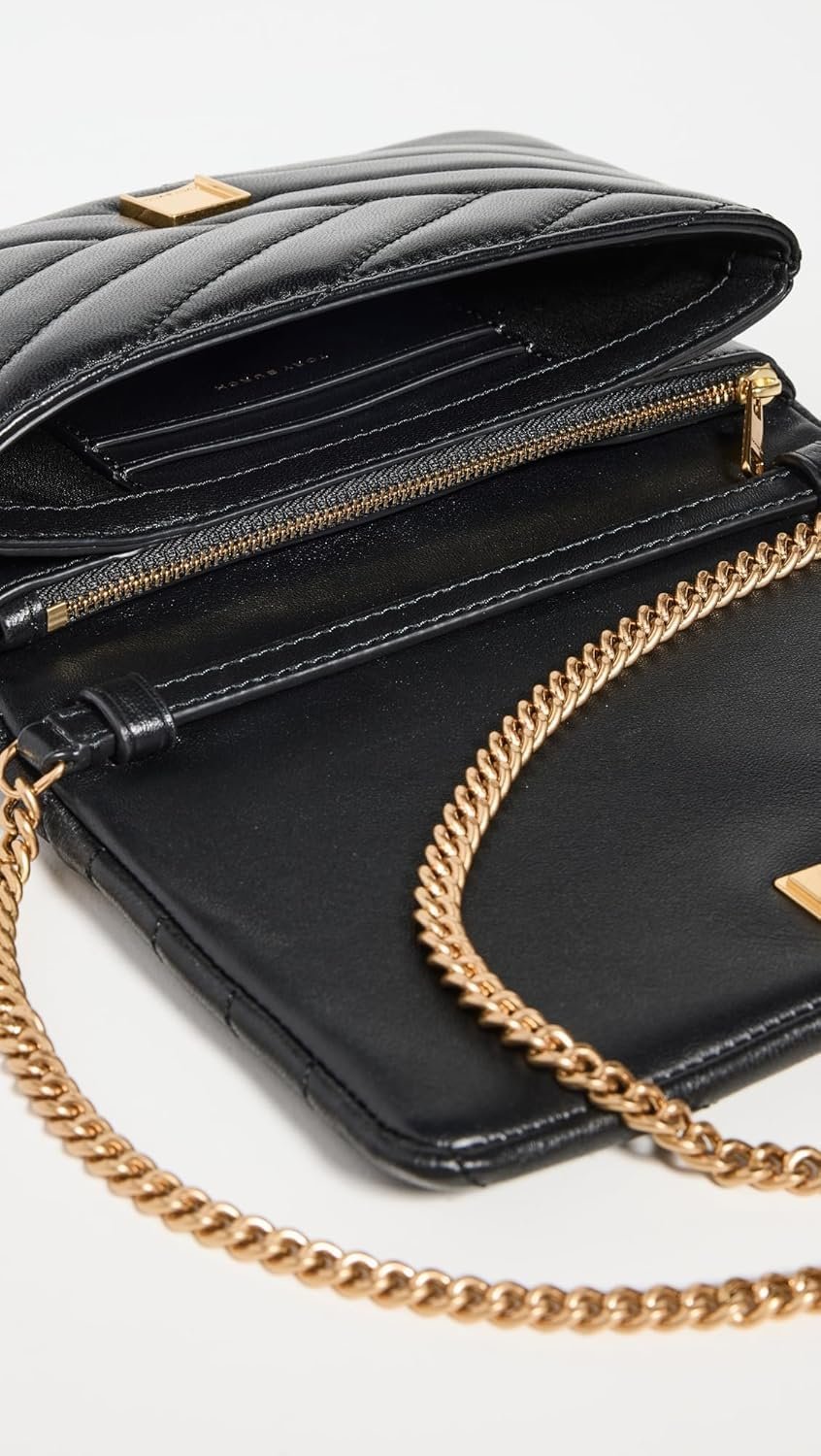Our beveled Double T as graphic hardware on the Kira Chevron Chain Wallet. Wear it crossbody with the removable chain-and-leather strap or carry it like a clutch.