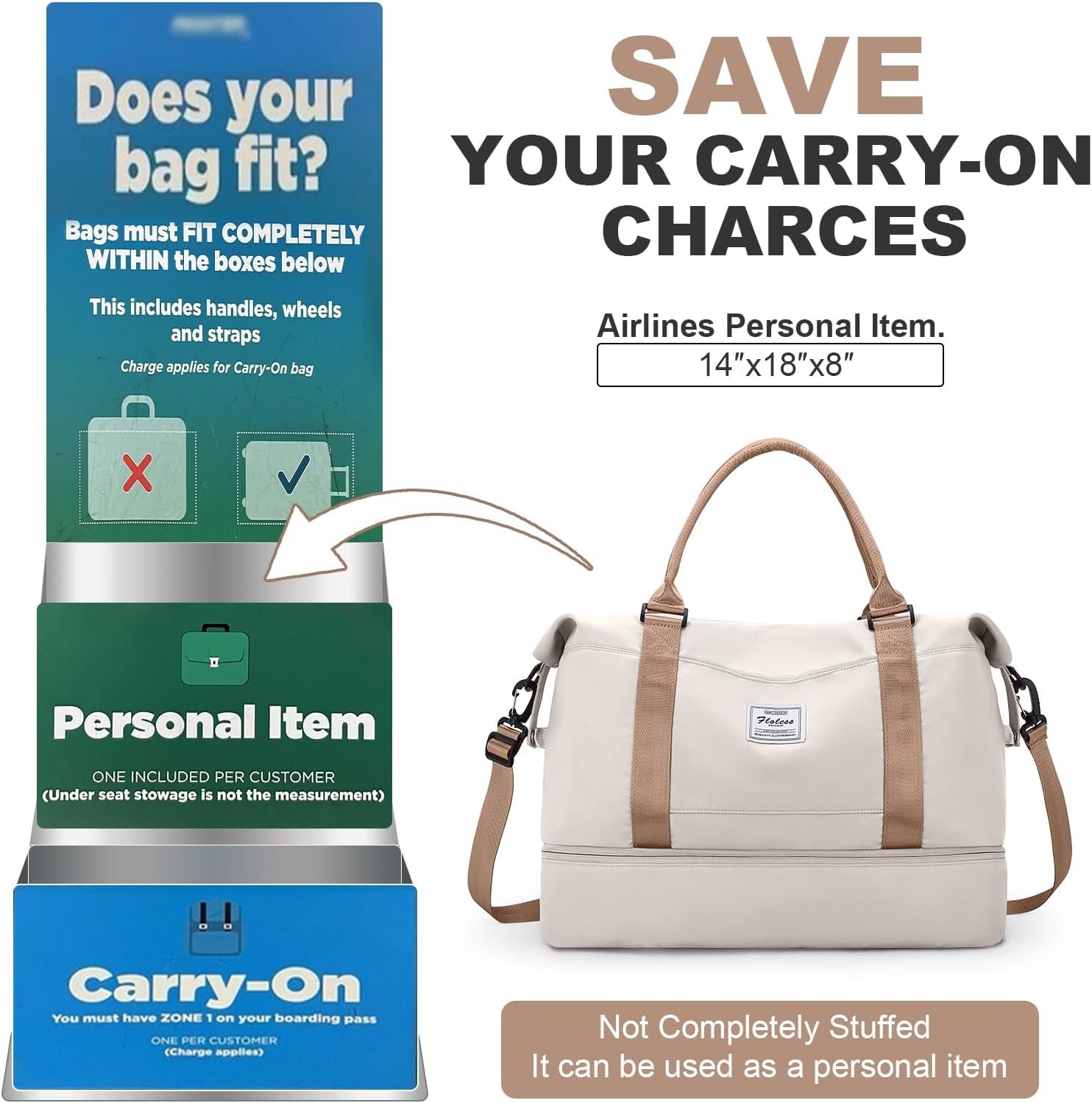 As Airlines Personal Item: Size: 14″x18″x8″,save your carry-on charces;It fit perfectly under the seat on the flight down and in the overhead compartment. And the travel bag can attaches to suitcase trolley,free your hands to enjoy your trip