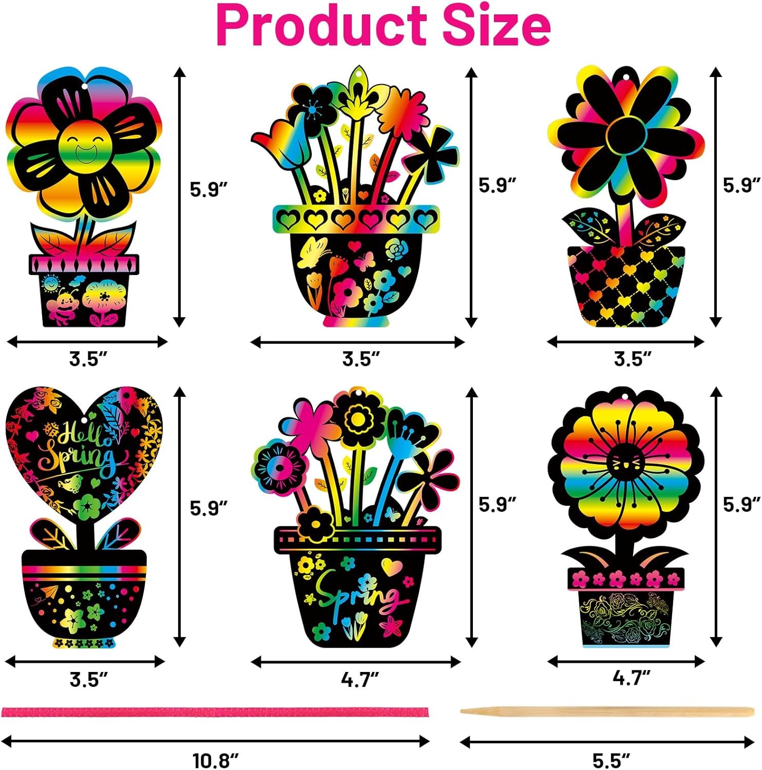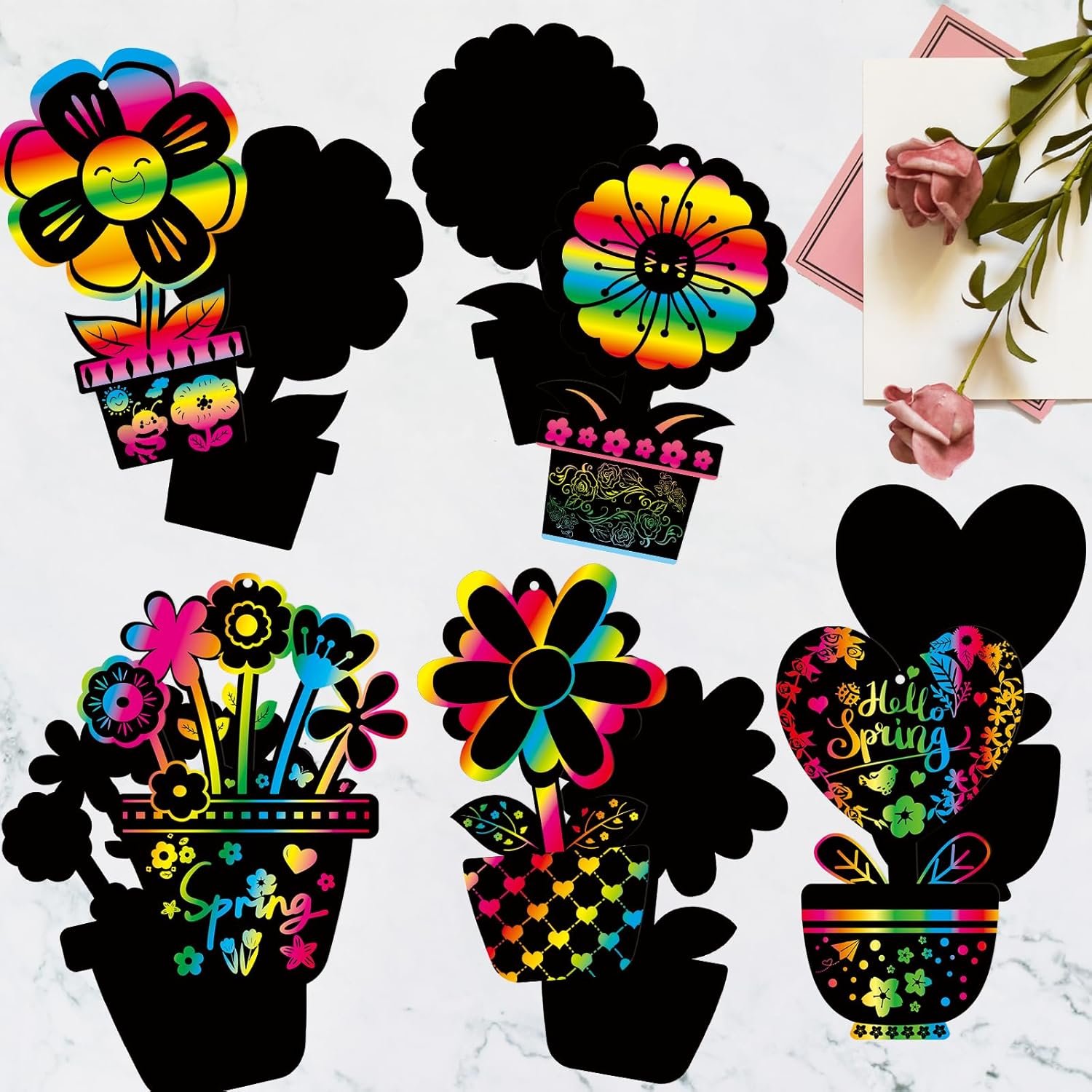 Unique Design: These spring magic color scratch kits feature 6 different designs; Kids can scratch to reveal flower pot cards in various colors and styles