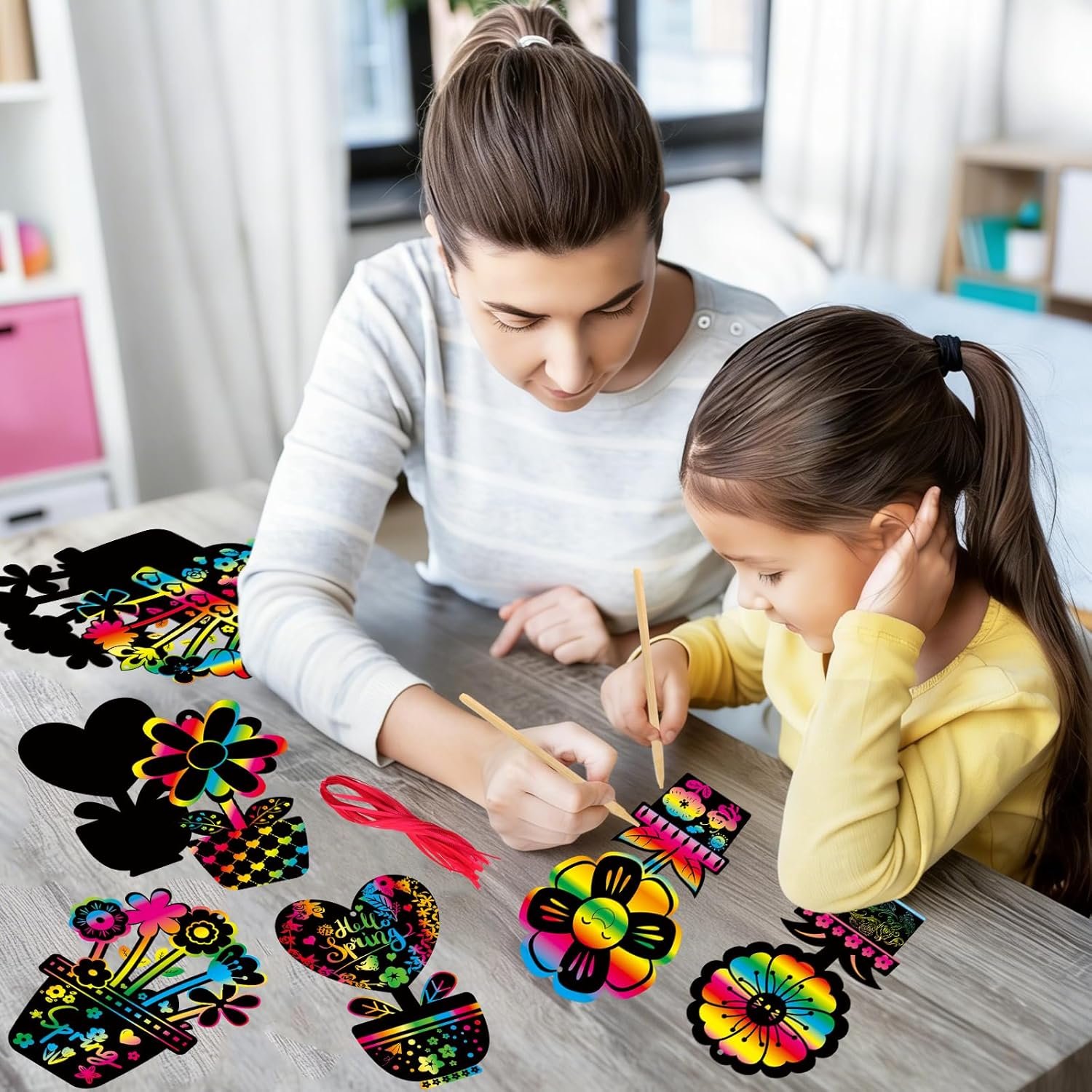 Design: These spring magic color scratch kits feature 6 different designs