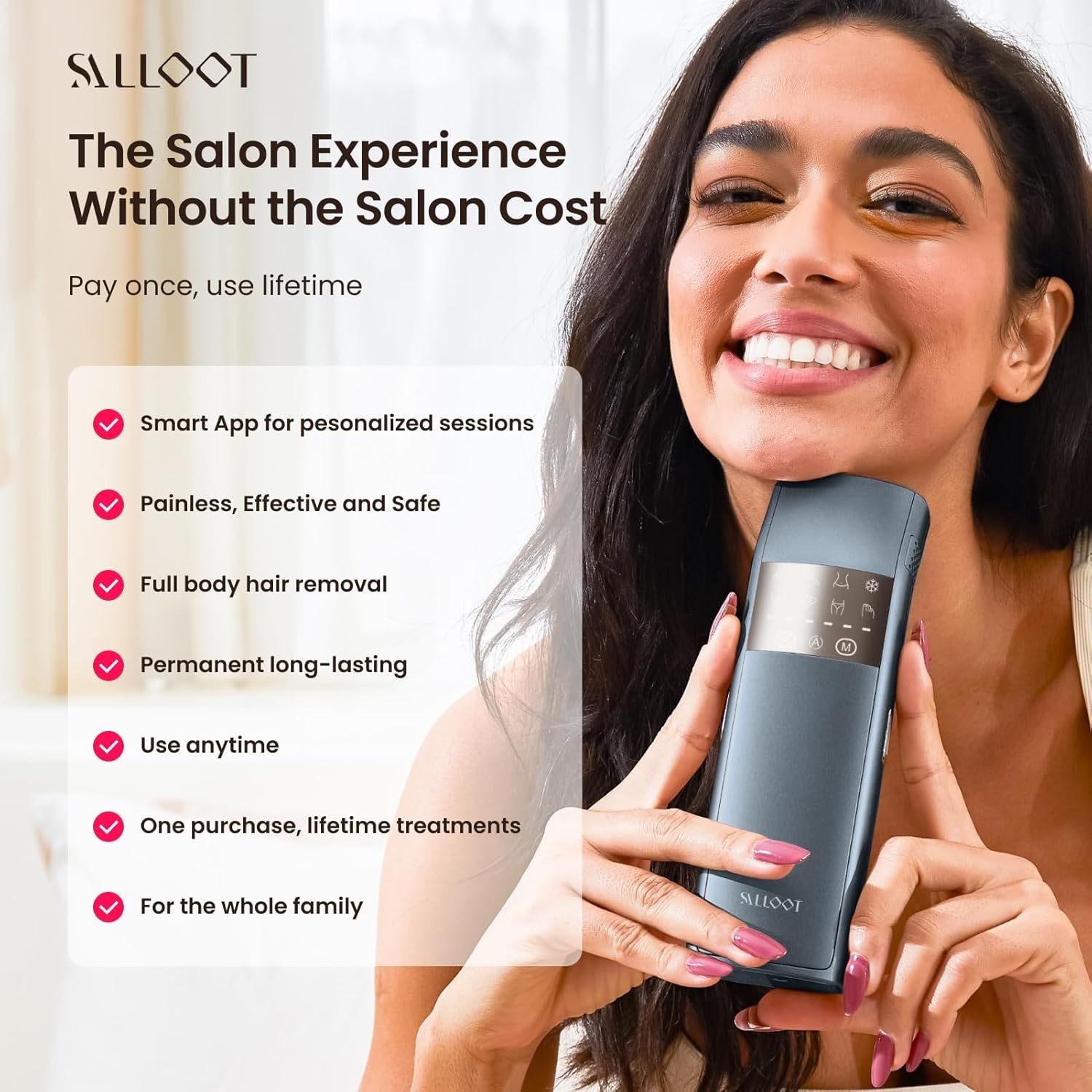 SMART AI IPL, Redefine Your Hair Removal. The Smart AI App auto-recommends personalized treatment plans with reminders, energy levels, and suitable flash settings based on your skin tone, hair color, density, and treatment area. Real-time AI analysis reports to minimize ineffective hair removal, It is like your personal beautician at home