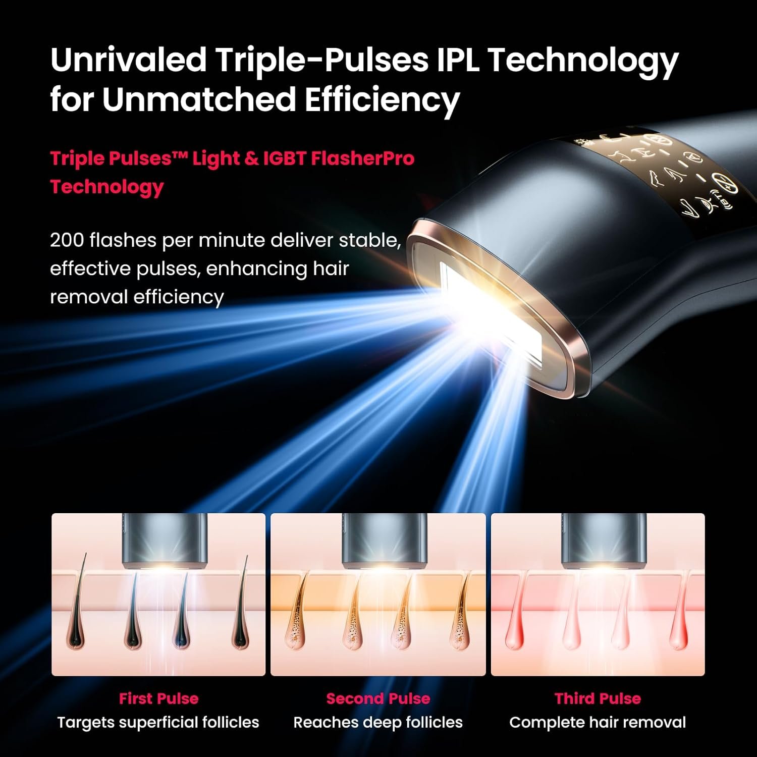 TRIPLE Pulses IPL the Effective Treatment: The Trinity iGlow 10 utilizes TRIPLE Pulses IPL and IGBT FlasherPro technology, concentrating all energy on the hair follicle to enhance hair removal efficiency by 87% compared to single-pulse IPL. Equipped with 200 flashes per minute and auto gliding flashing mode, the laser hair removal allows you to perform sessions at home in just 2-8 minutes