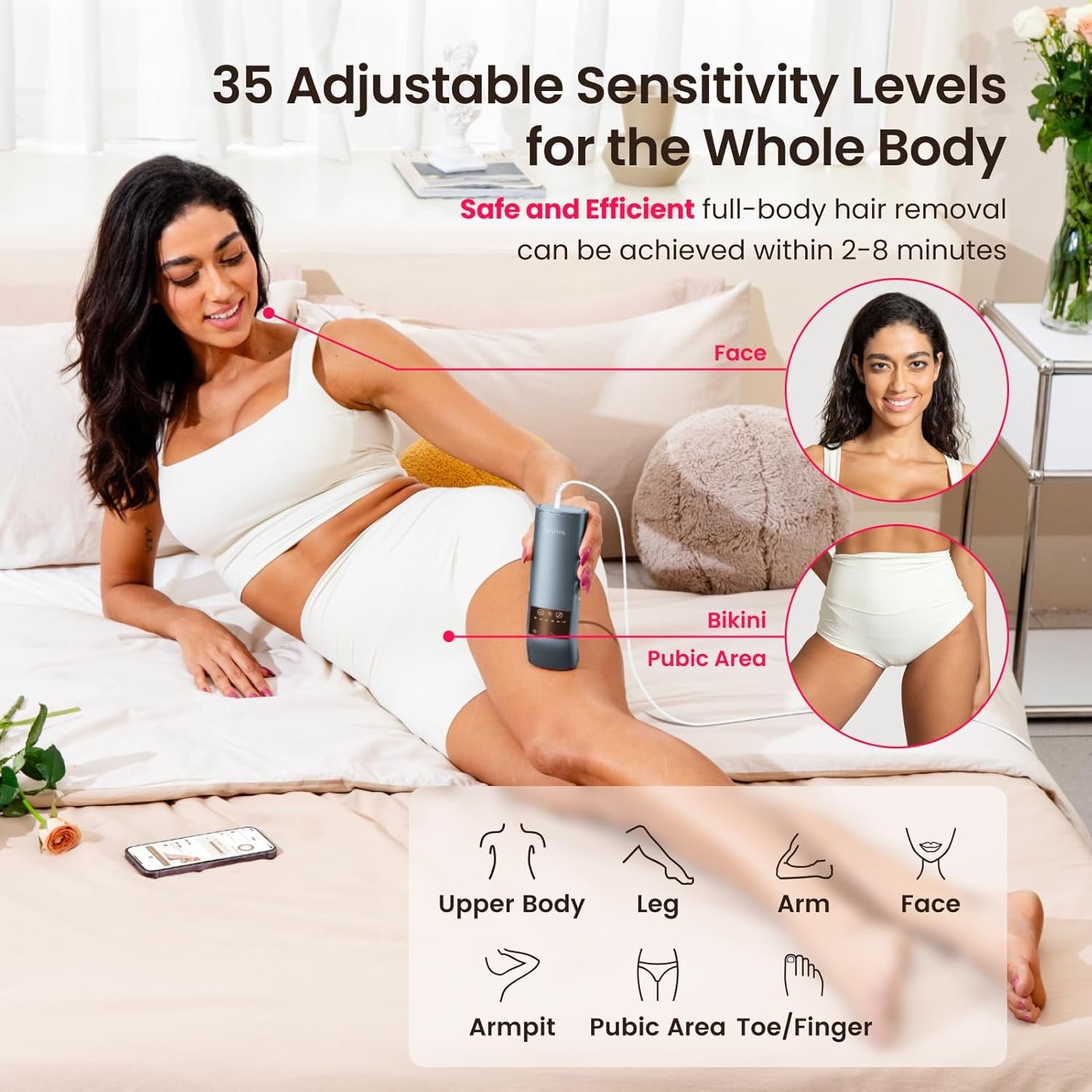 Ergonomic Design, Easy to Hold: 30-degree design is easy to hold and ensures optimal fit for all body areas, especially for bikini, underarms, and lower legs. The intuitive LED touch screen and double flashing button settings for easier operation. Say goodbye to costly salon, disposable razors and painful waxing