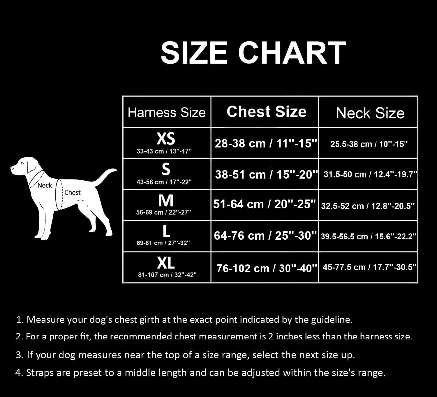 5.Please measure your dog’s chest circumference. Chest size: XS(11-15 inches), S(15-20 inches), M(20-25inches), L(25-30 inches), XL(30-40 inches). If your dog’s chest is approaching the max chest size, you may choose the next size up.