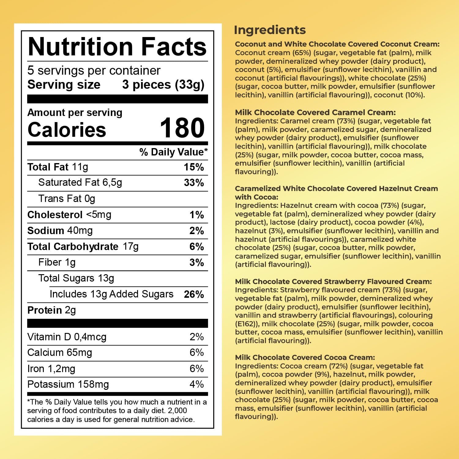 Detailed Flavor Assortment: Inside this chocolate box you’ll find a carefully balanced variety of flavors including Milk Chocolate Covered Caramel Cream, Caramelized White Chocolate Covered Hazelnut Cream with cocoa, Milk Chocolate Covered Cocoa Cream, Milk Chocolate Covered Strawberry Flavored Cream and Coconut & White Chocolate Covered Coconut Cream. Each piece delivers a distinct taste profile.