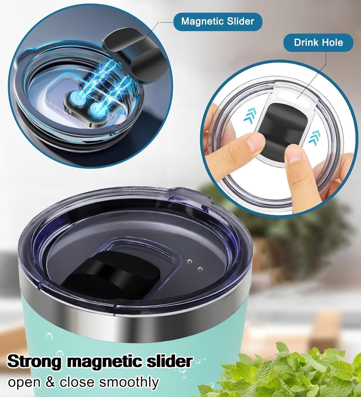 【Strong Magnetic Slider】: The strong magnetic slider on the top makes open and close smoothly, it will firmly and seamlessly covers the drink draw hole without droping off no matter the cup moving on or shaking. Tha’t very safe for you to put in car or handle while walking.