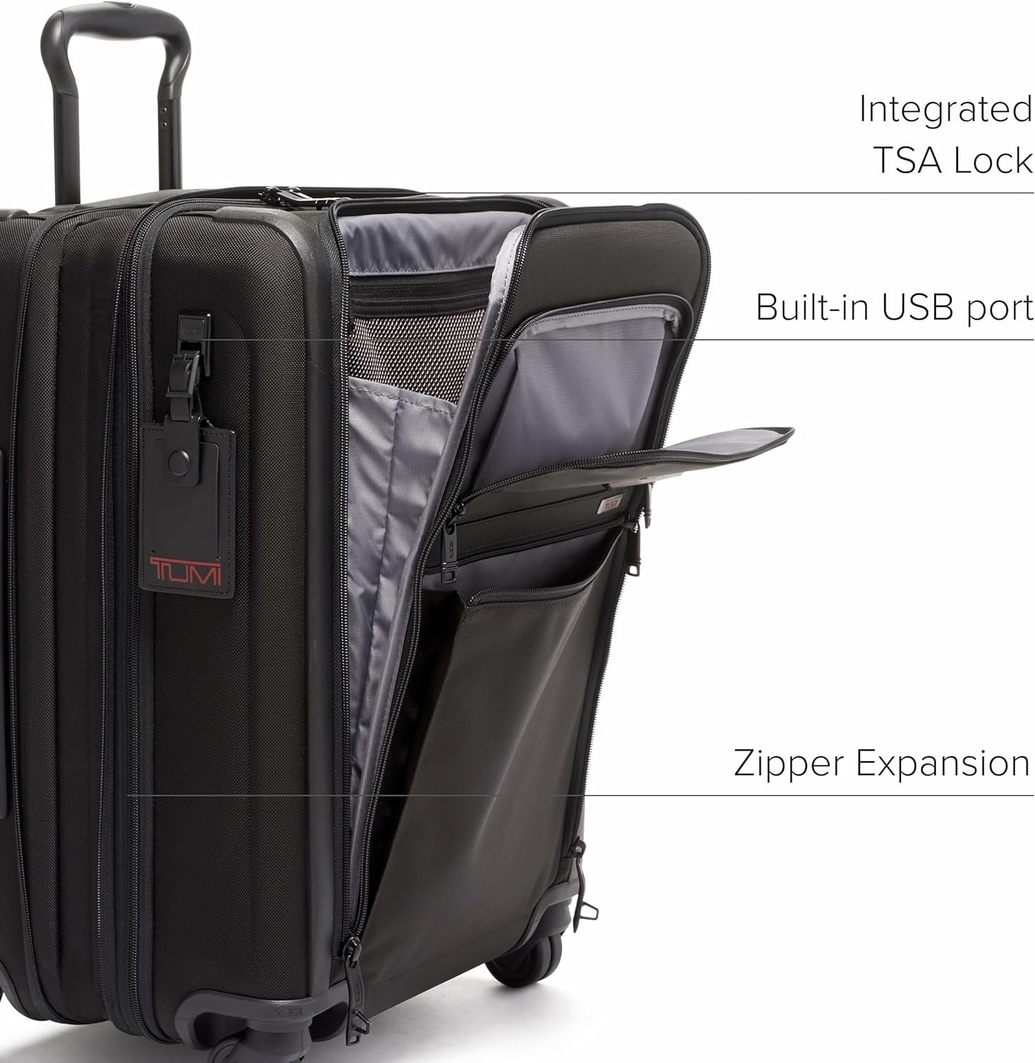 Tech-Savvy Suitcase for Men & Women: This compact suitcase with wheels boasts a built-in USB-C port for on-the-go charging and TUMI Tracer for added security