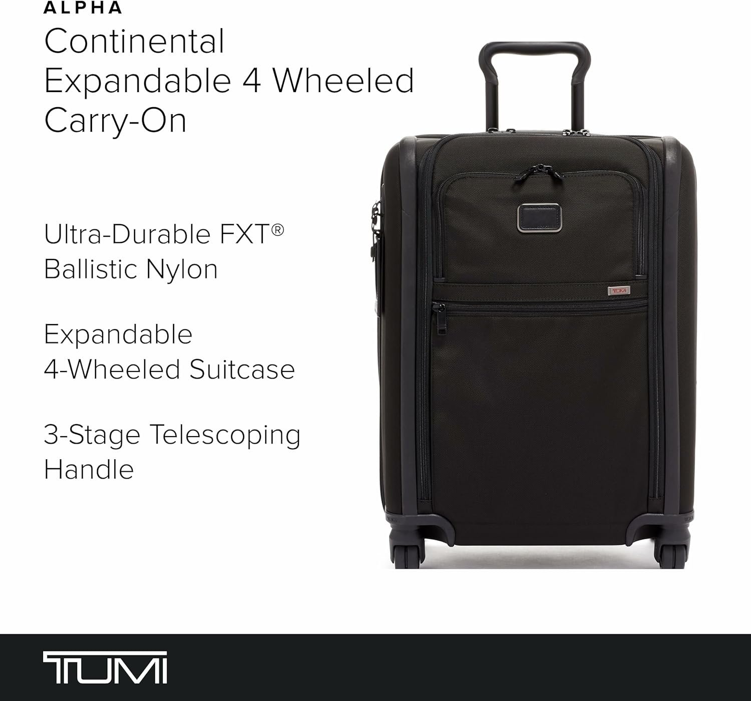 Durable Travel Suitcase: The TUMI Alpha Continental Expandable 4-Wheeled Carry-On is a stylish suitcase featuring FXT ballistic nylon for lasting resilience on its 4 wheels