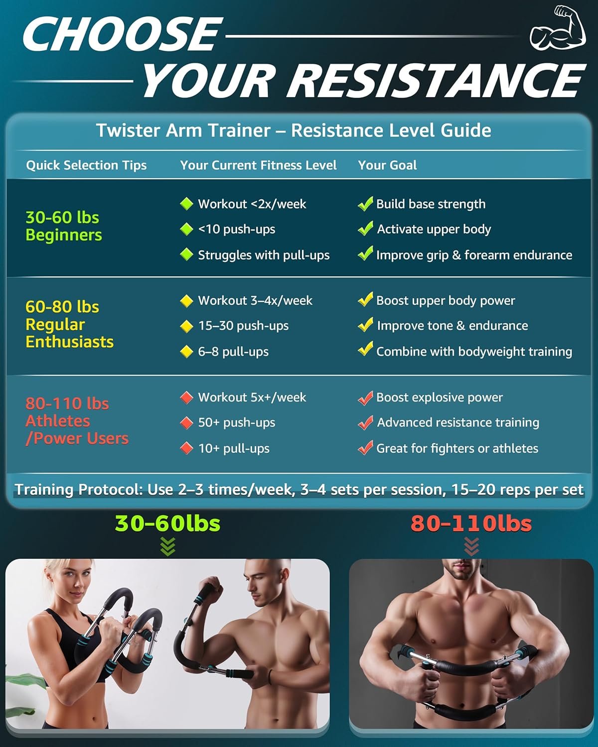 Resistance Pick Guide: Available in 30-60lbs and 60-80lbs options—30-60lbs is perfect for beginners looking to build base strength, improve grip endurance, and activate upper body muscles; 60-80lbs is ideal for regular strength trainers aiming to improve tone, muscular endurance, and enhance bodyweight routines.