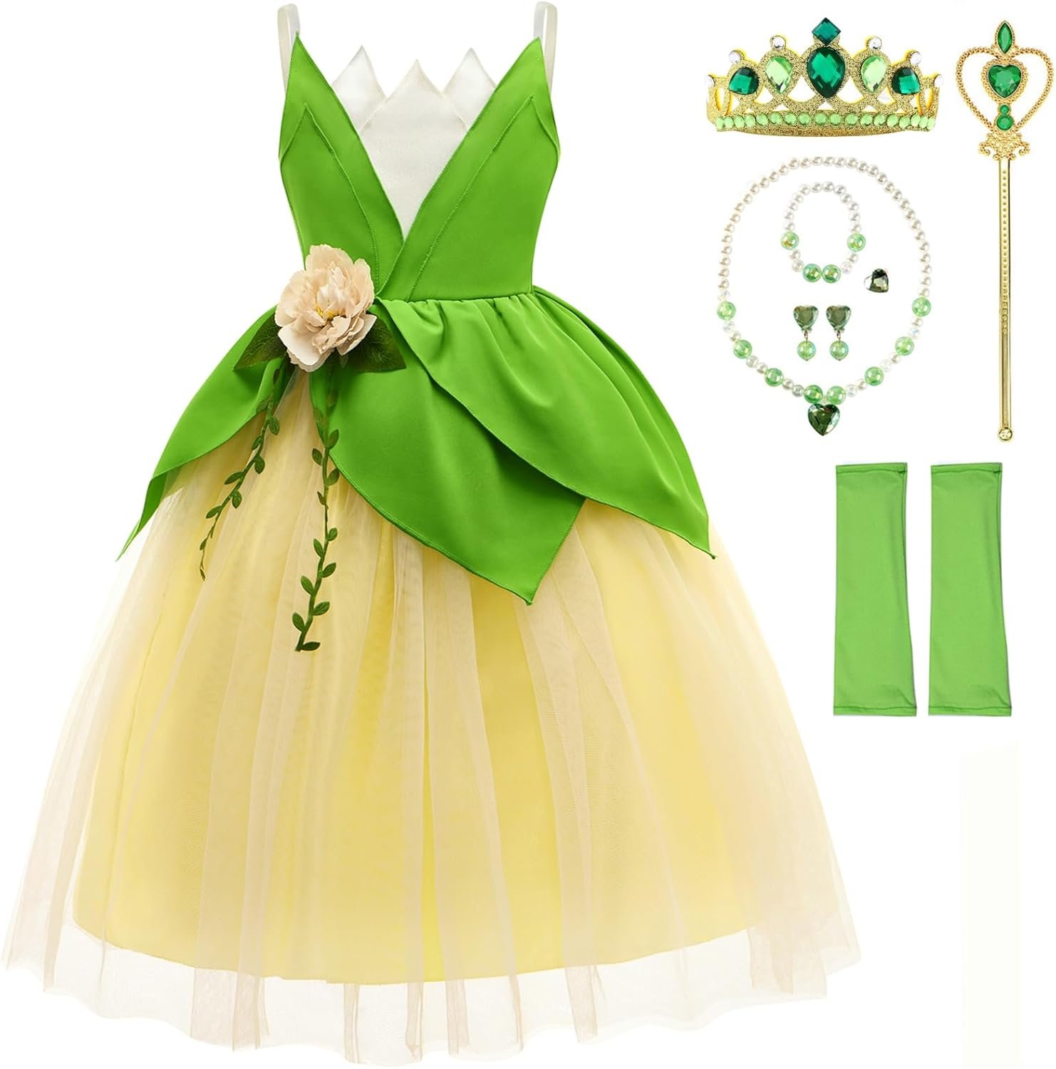Yes, package includes 1 pc dress, 1 pc tiara hair comb, 1 pair of white gloves and 1 pc choker.