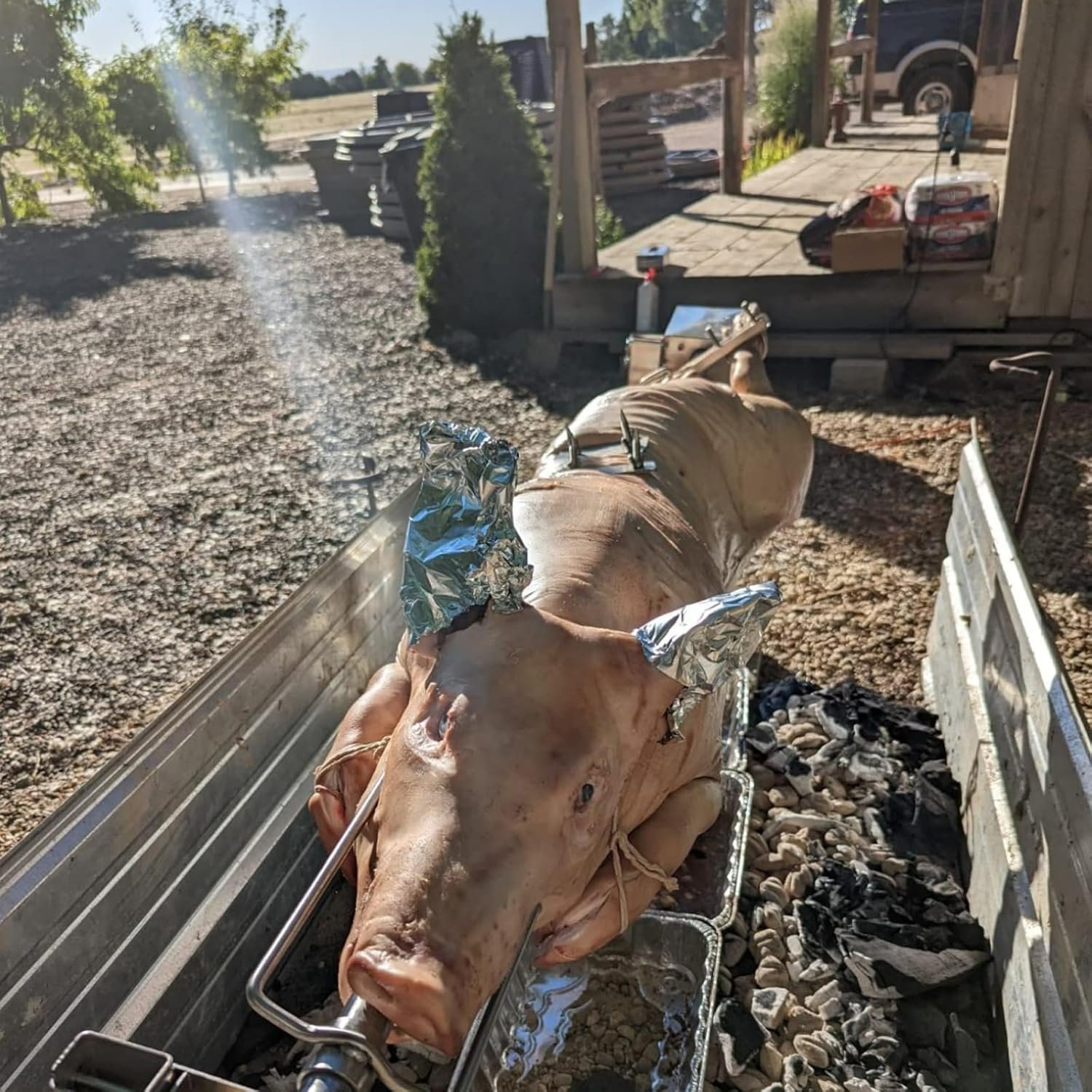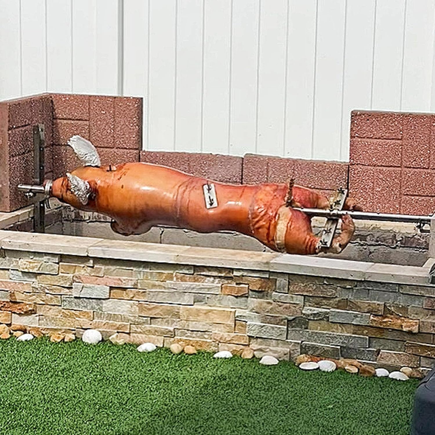 Easy to use, fastens animal to the spit rod without tools in minutes