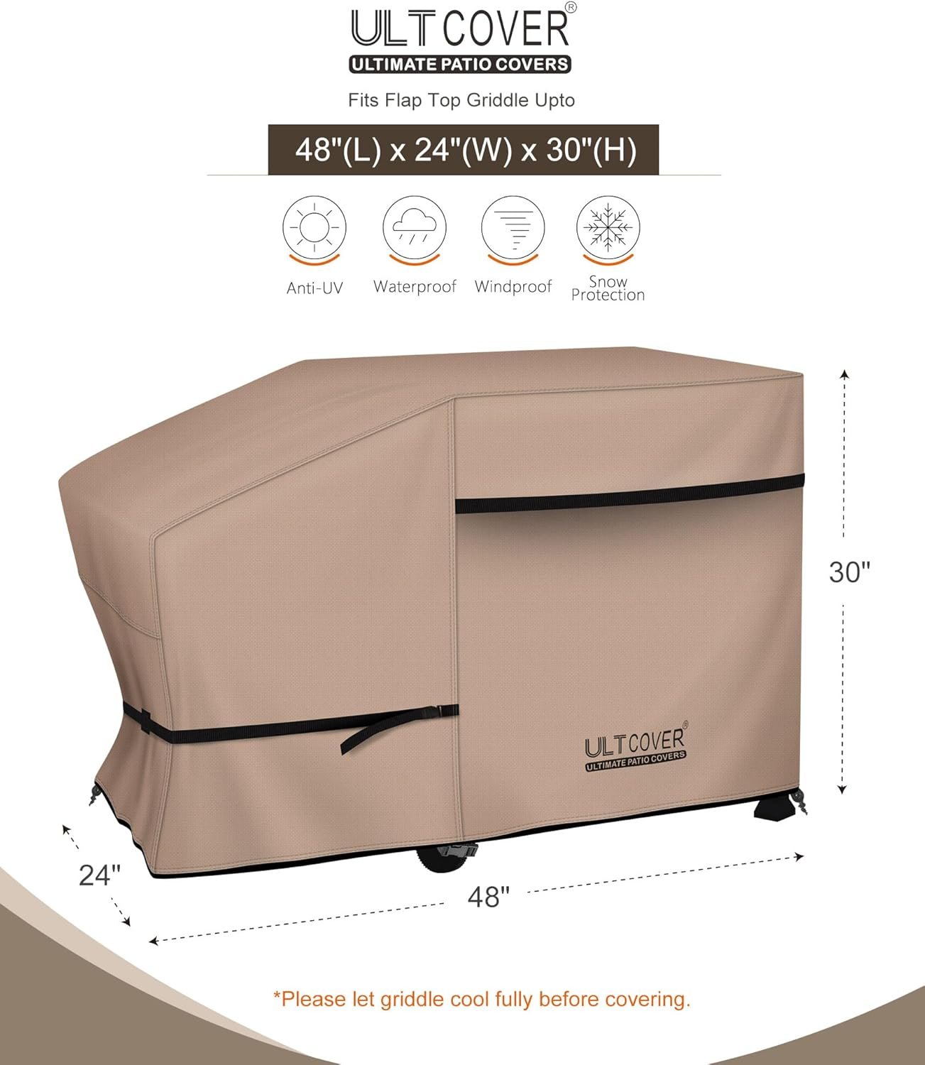 General to fit most 28 inch single shelf griddle station with hood size up to 48″(W) x 24″(D), Please wait until the griddle is completely cool before putting on the cover