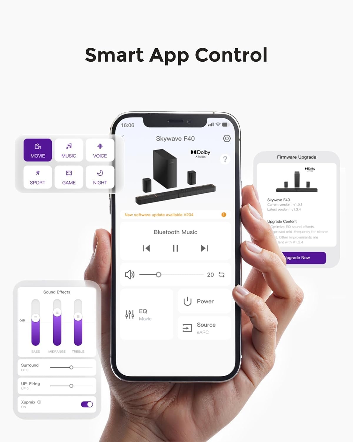 Advanced App Control: Customize every detail of your audio experience with the Ultimea App. Fine-tune your surround sound with 13-step level adjustment (-6 to +6), optimize with a 10-band graphic EQ, and choose from 121 preset sound settings. Enjoy seamless OTA updates that unlock new features and keep your system performing at its peak.