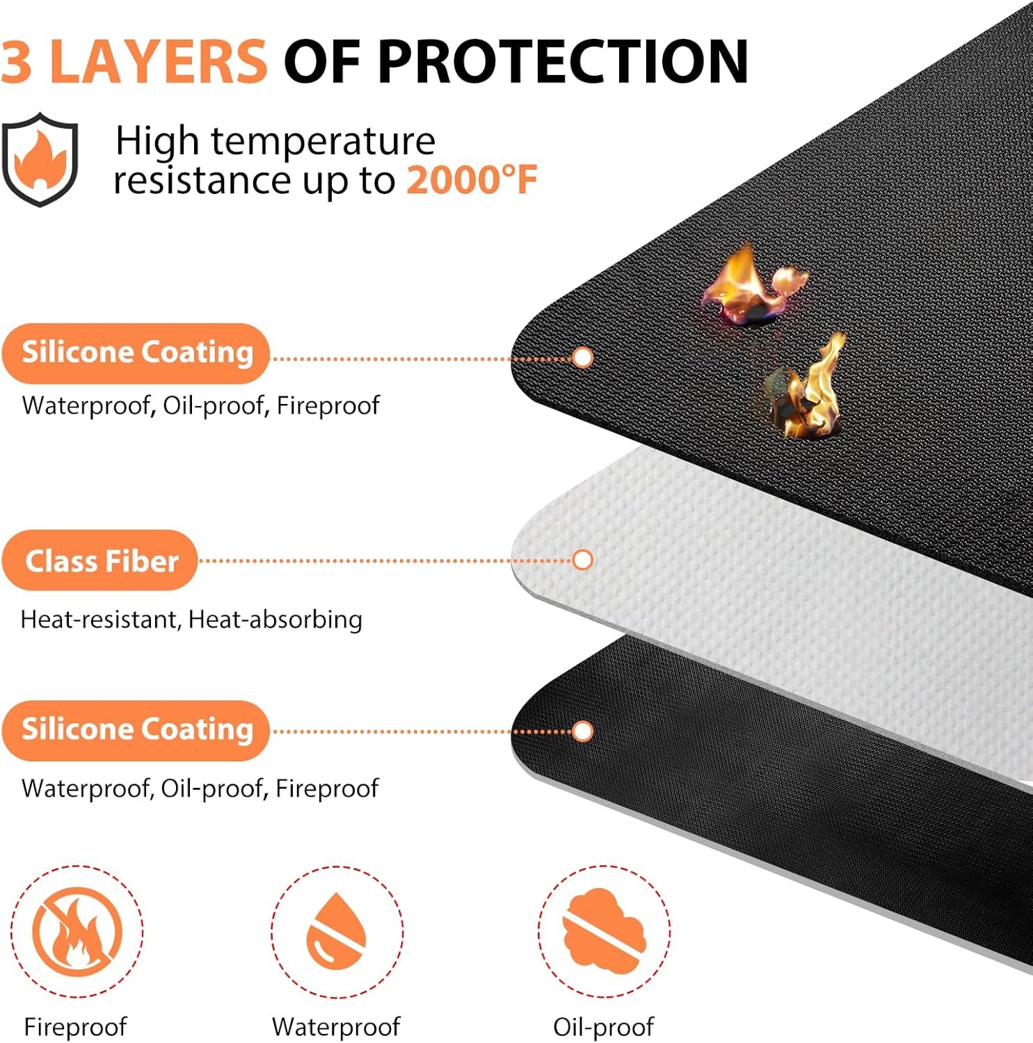 Fire Resistant and Heat Resistant: Our grilling mats for outdoor grill are made of fiberglass and can withstand temperatures up to 2000°F. Double-sided thickened silicone coating provides three layers of fire resistance for added safety. The edges of our heat resistant mat are finely stitched and will not stick, tear, curl or crack from the heat, would contain some liquid spills