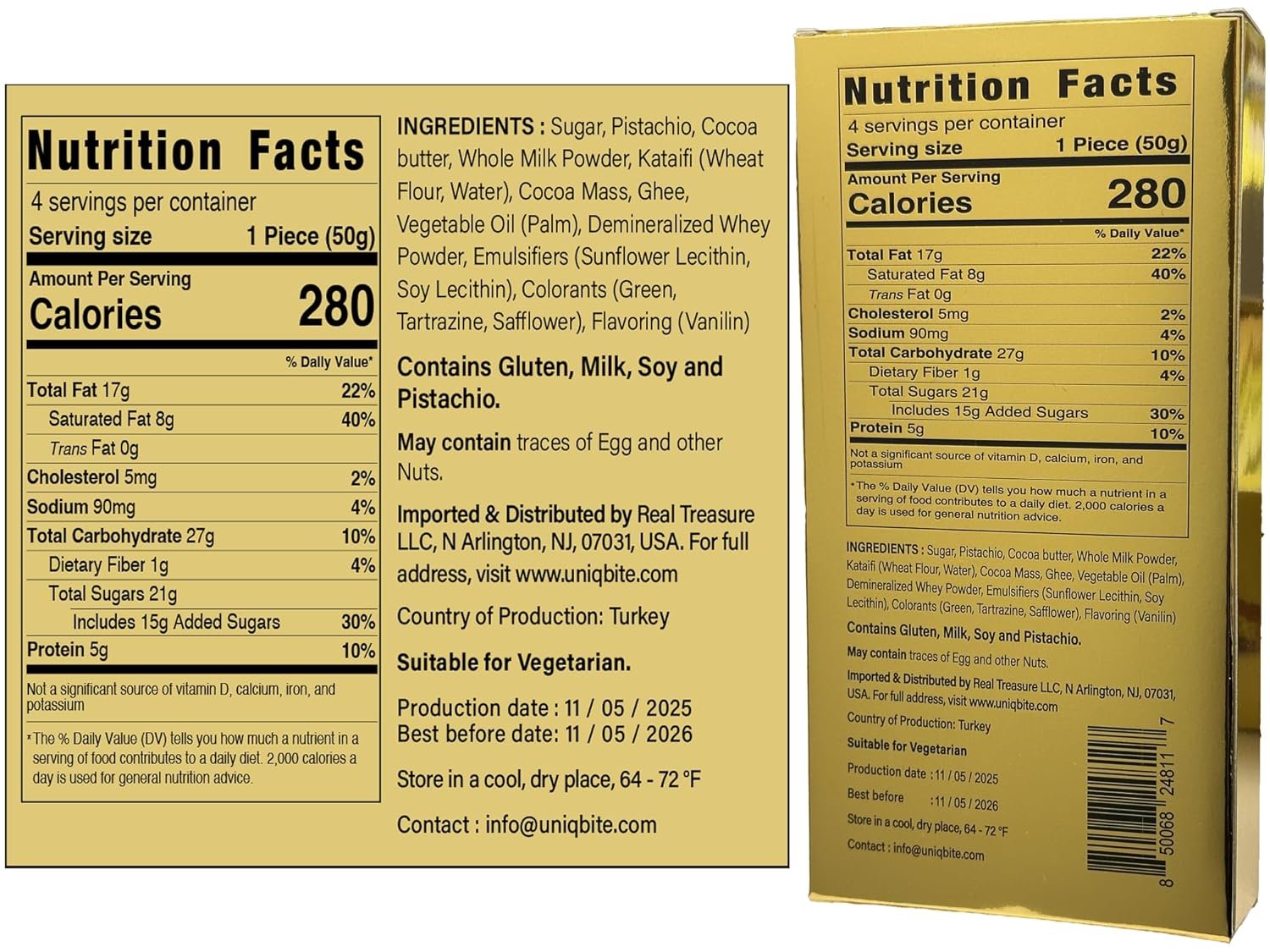 Indulge in the irresistible fusion of Middle Eastern flavors with the UniqBite Dubai Chocolate Bar. This viral sensation combines the rich, creamy texture of pistachio with the decadent taste of chocolate and the crunch of knafeh. Crafted with care, this 7 oz (200gr) bar features a luscious pistachio cream enveloped in delicate kataifi strands, all enrobed in a luxurious chocolate coating.