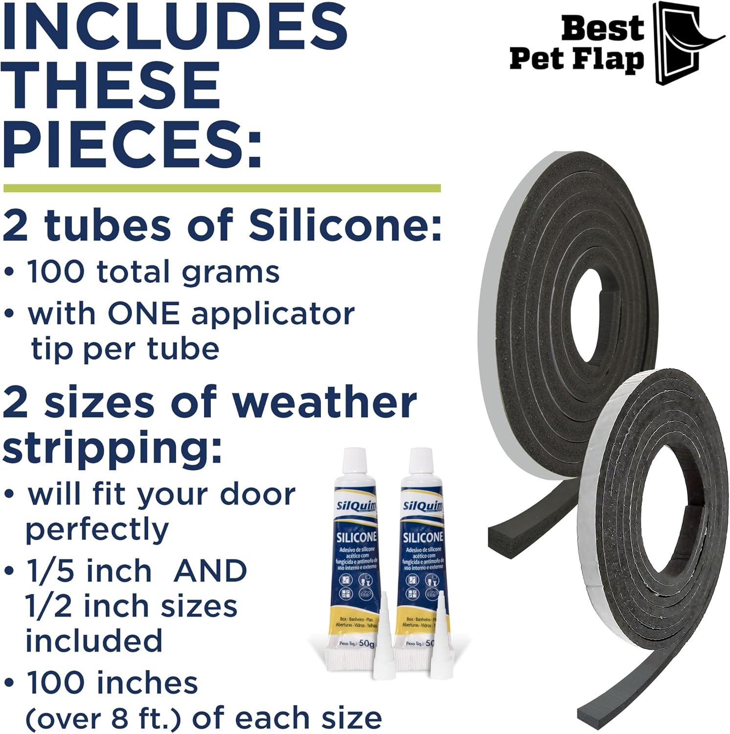 The Best Pet Flap Universal pet door installation and weather proofing kit fits all brands of pet doors. Use the 2 included foam weather stripping rolls to improve the fit and keep our wind and moisture. The 2 tubes of silicone will add a moisture barrier around your pet door.