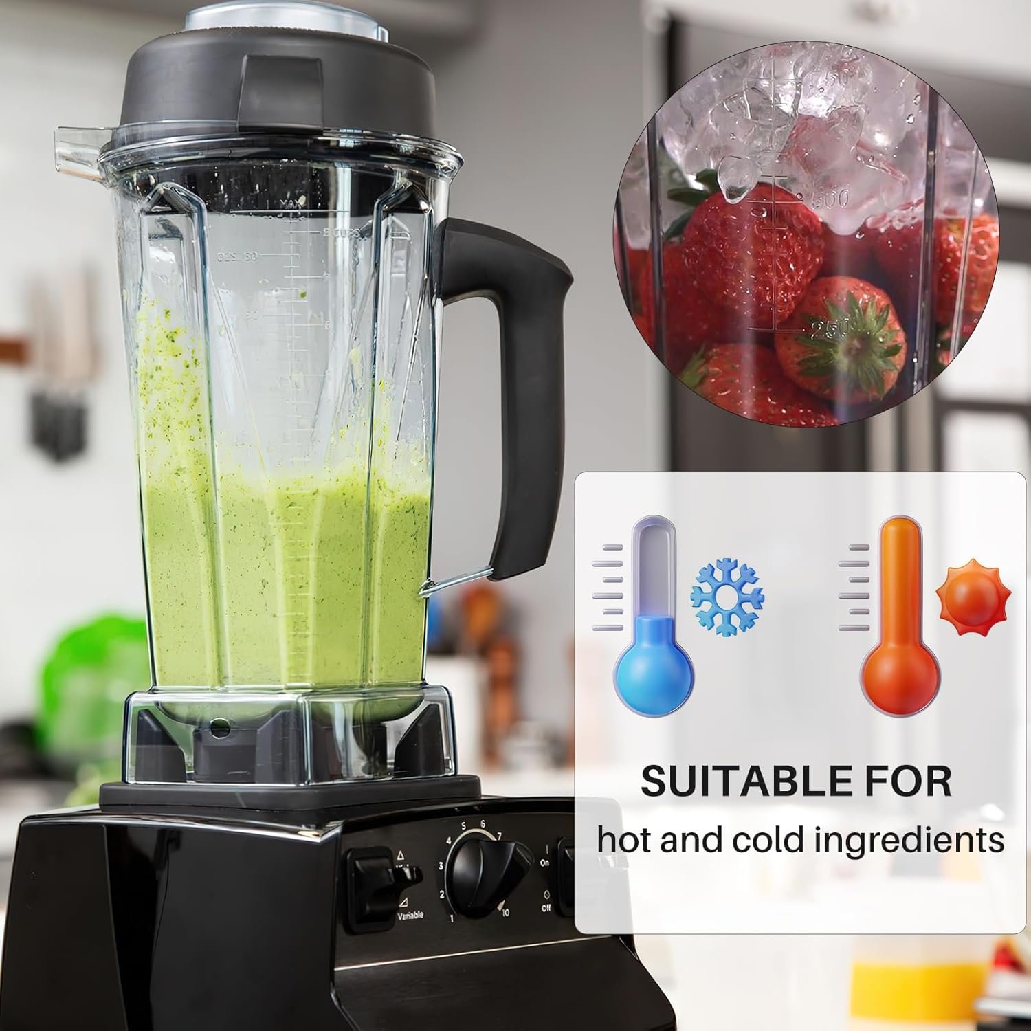 Safety Material: Container Pitcher Jar for Vitamix 5200 blender 64 oz is made of BPA-free Polypropylene, which will not release any harmful substances that may affect your health at high temperatures; Different from other plastic and metal materials, Each 64 oz container undergoes multiple temperature tests before leaving the factory, ensuring top quality; It will not produce any harmful substances that may affect your health