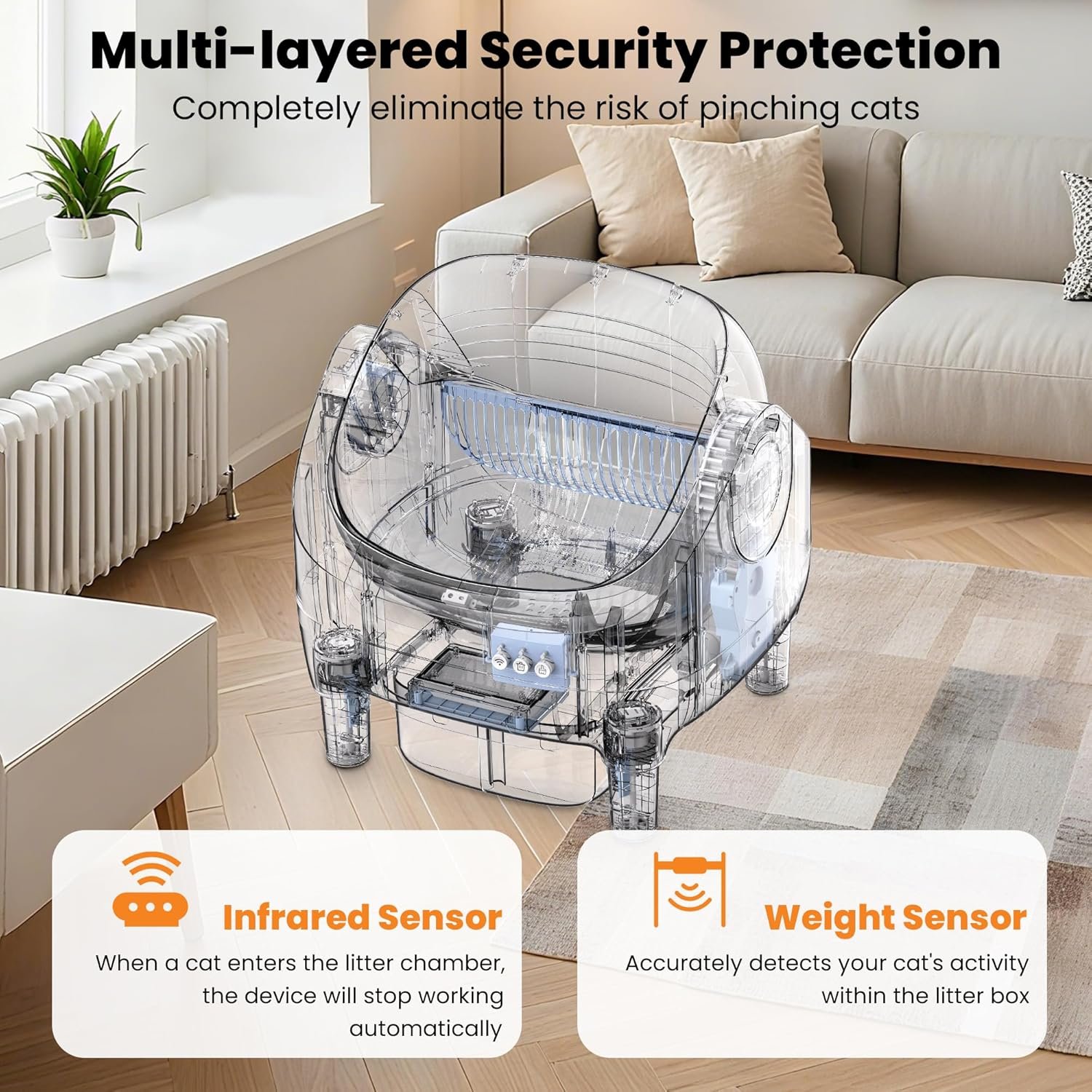 ADVANCED SAFETY PROTECTION: Prioritize your cat’s safety with our advanced monitoring system. Featuring infrared sensors, weight detection, and anti-pinch technology, this self-cleaning litter box actively detects your cat’s presence. The design incorporates safety measures to minimize potential pinch points. Crucially, the cleaning cycle automatically pauses if your cat enters during operation, helping to prevent accidents and provide a secure environment.
