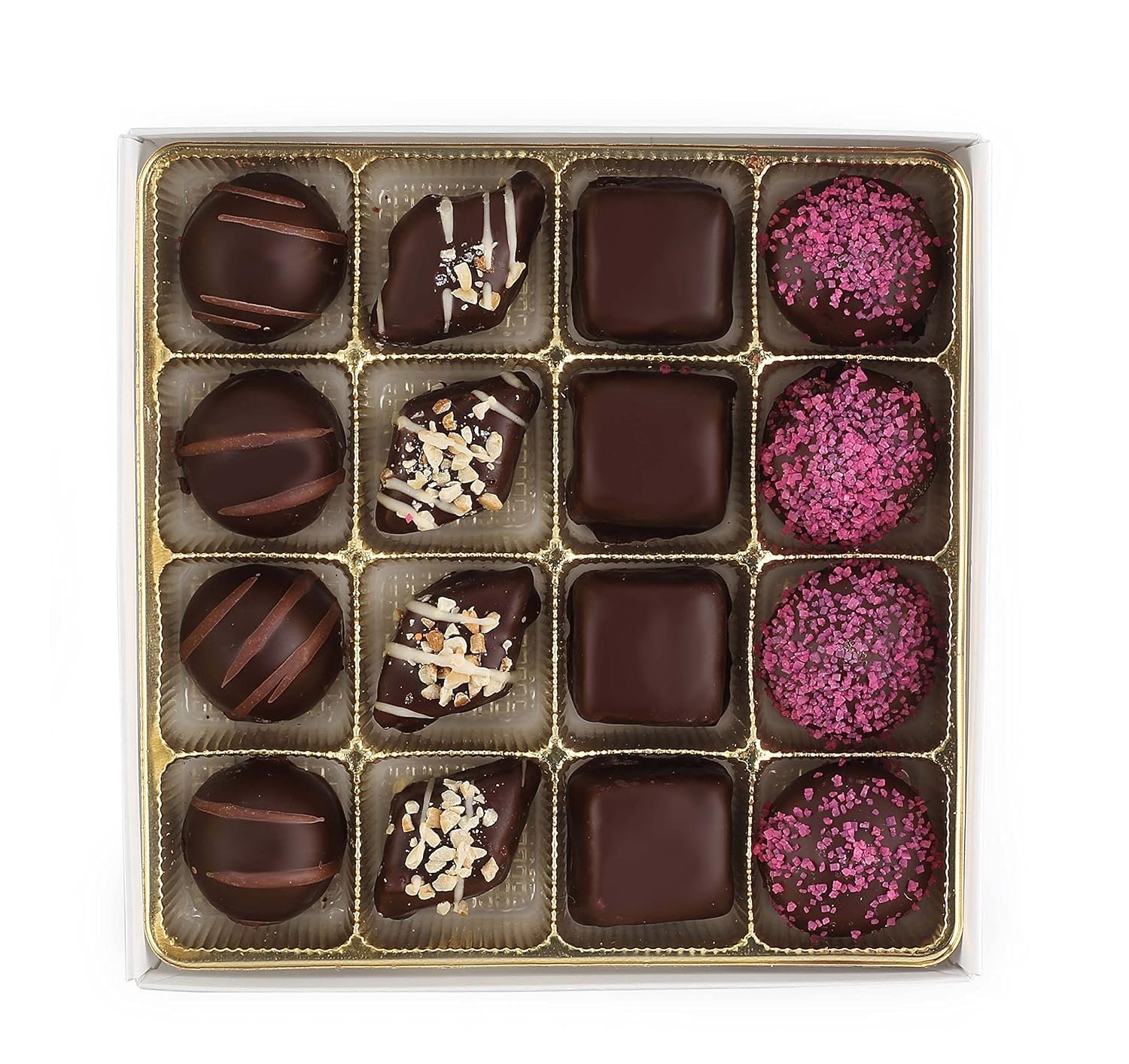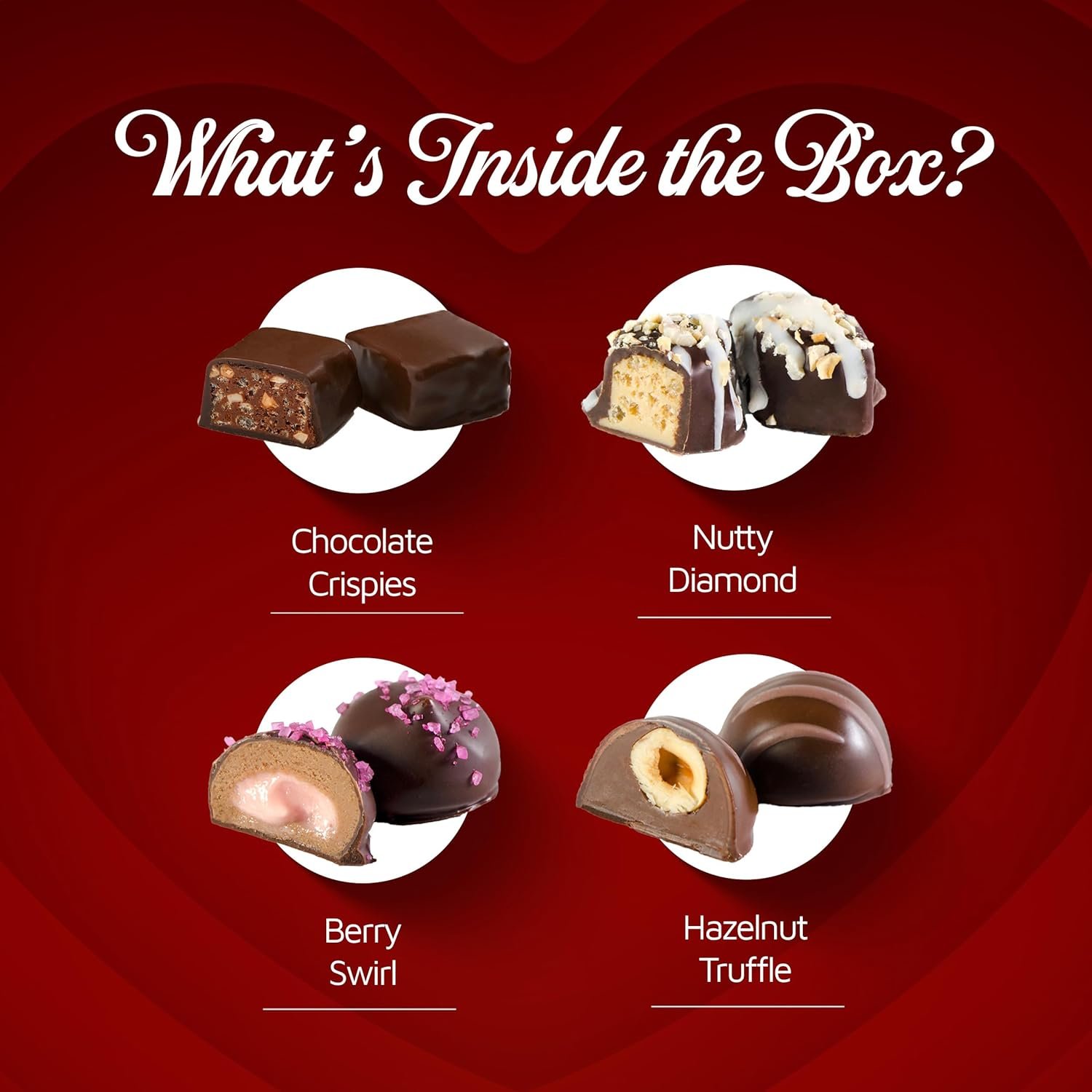 Fancy Assorted Chocolates; Four distinct gourmet chocolate candy flavors from gourmet truffles to crispy Choco Crunch, smooth Peanut Butter to berry bright Strawberry Swirl,each boxed chocolate truffle offers unique taste experience worth savoring