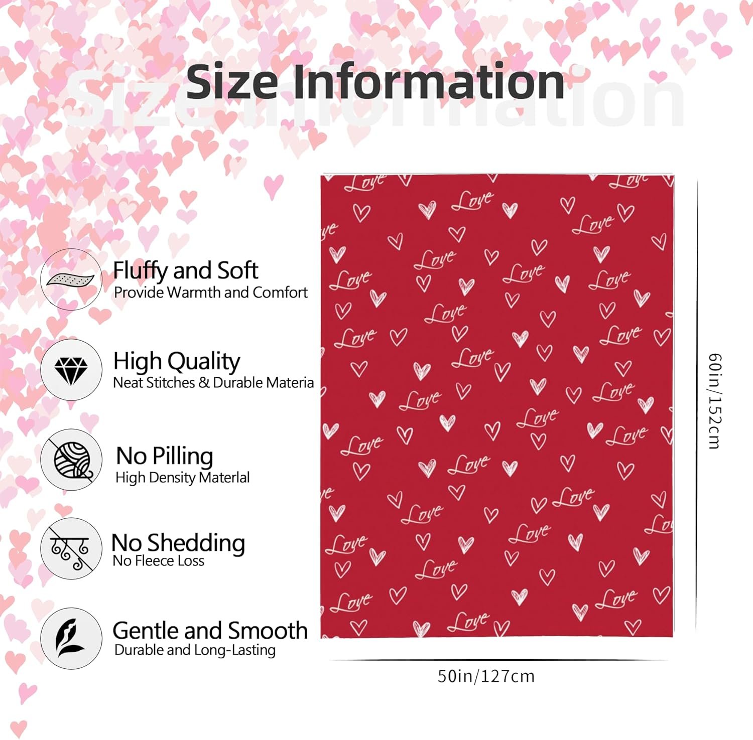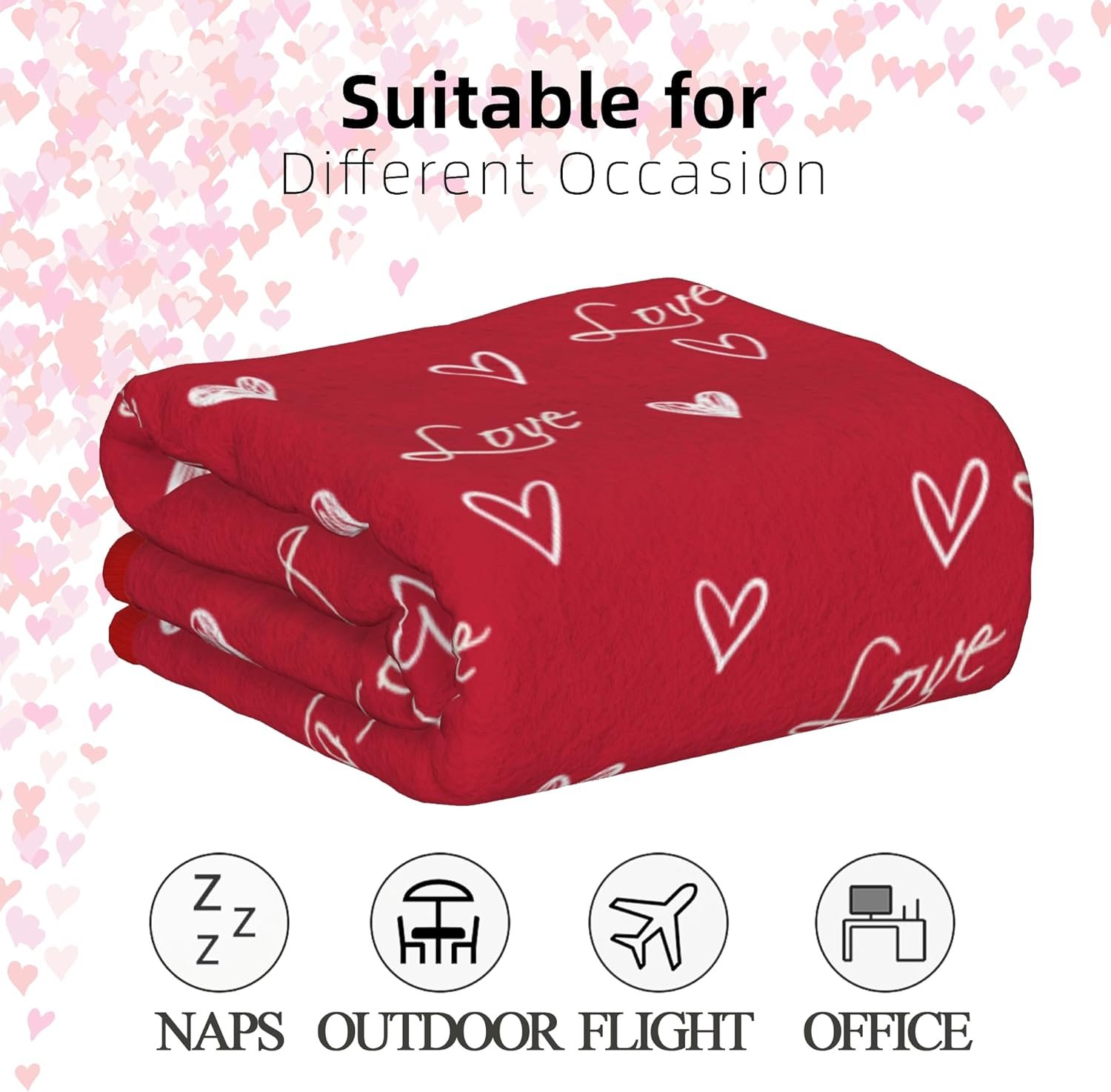 Super Soft Microfiber : This silky soft loving heart blanket is made of premium flannel is It is wrinkle and fade resistant and doesn’t shed! Silky smooth to touch, warm, lightweight, and cozy, durable-quality throws and blankets for sofa meet the needs of lightweight and warmth, gently cover our soft blanket to feel cozy,making it a versatile choice for all season use.
