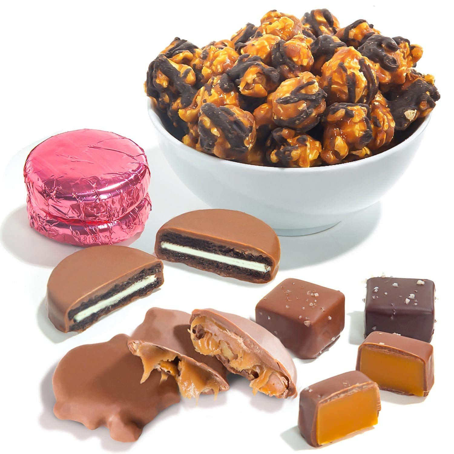 There’s so much for your Valentines to love with these chocolate favorites, featuring decadent treats including chocolate pecan clusters, assorted Valentine-theme chocolatey pretzels, and milk chocolatey covered sandwich cookies wrapped in pink foil.