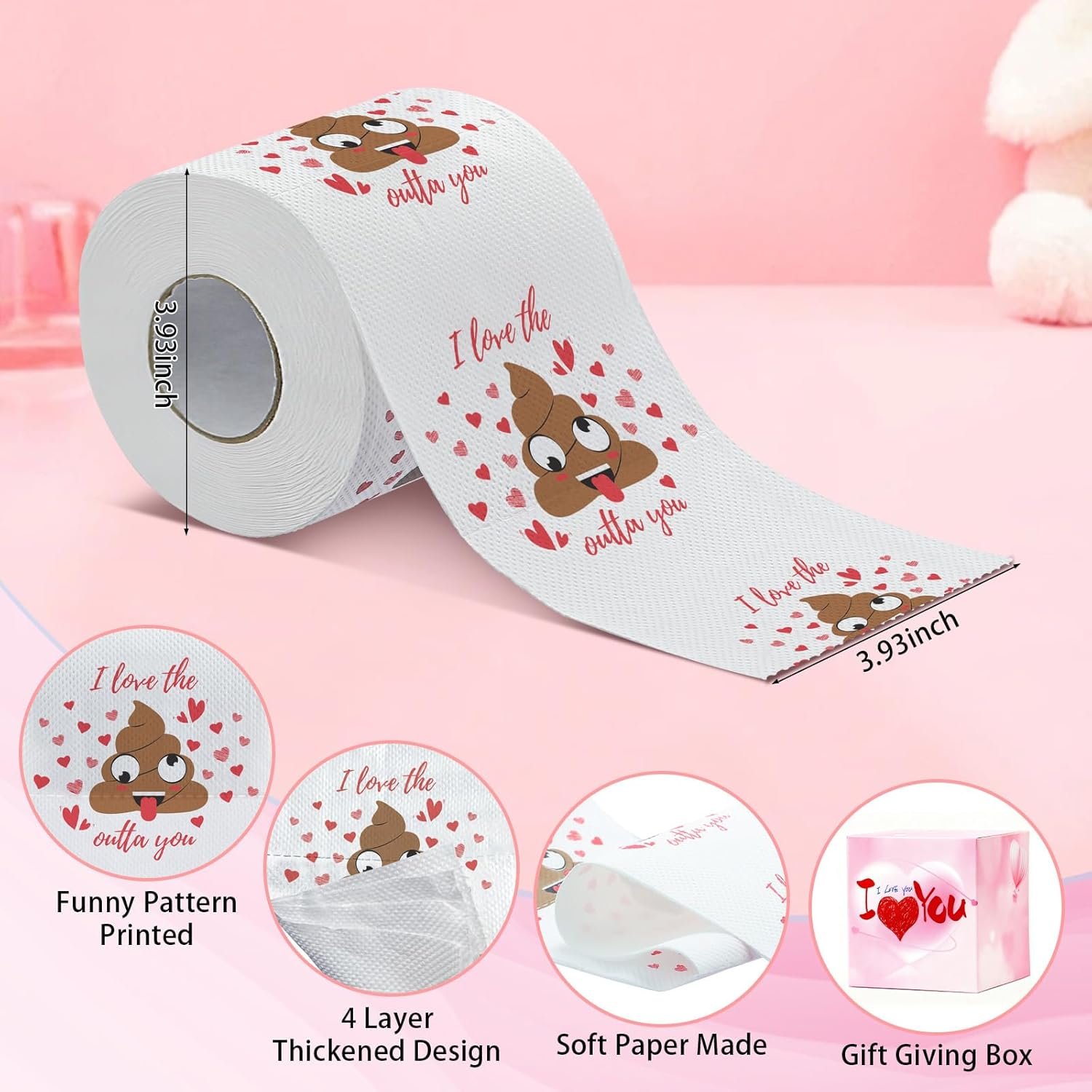 【200 Sheet 4-ply funny Toilet Paper with Fun Pattern】 This roll includes 200 soft and durable sheets with premium 4-ply construction. The cute Valentine-themed print stays clear and does not fade easily, adding a festive touch to your bathroom. Whether used as valentines toilet paper, funny toilet paper, or simply high-quality bathroom toilet paper, it delivers comfort while bringing delightful humor to your home décor.A sweet way to bring laughter to your daily life.