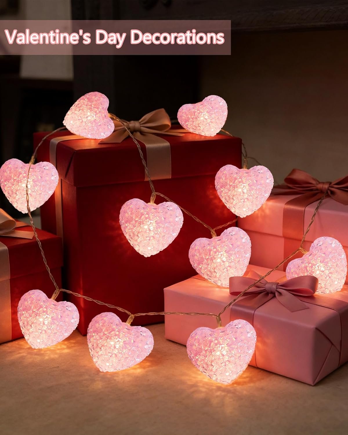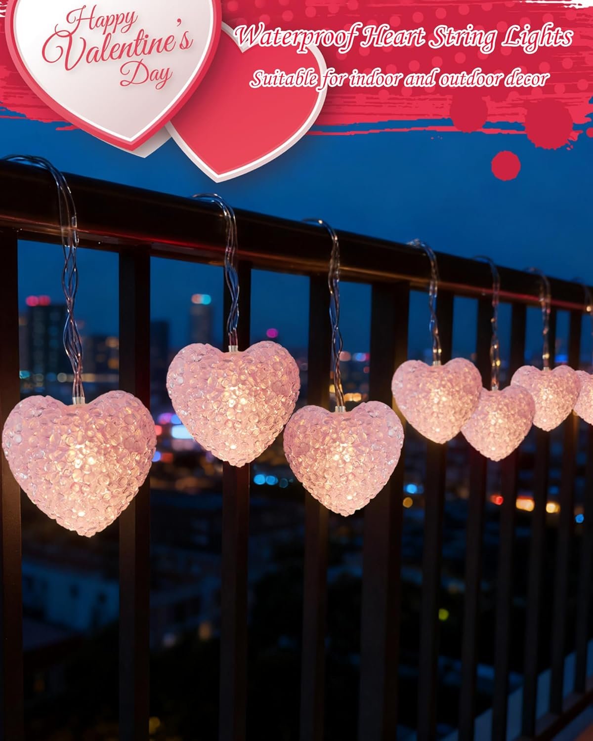 Shatterproof Heart Lights: Valentines Day lights adopts a pink crystal-like heart-shaped shell and each light string is equipped with 10 LED shatterproof plastic pink heart string lights. Valentines heart lights are 7 feet long, which give off warm white lighting, injecting sweet and romantic atmosphere into bedroom, party and Valentine’s Day scene
