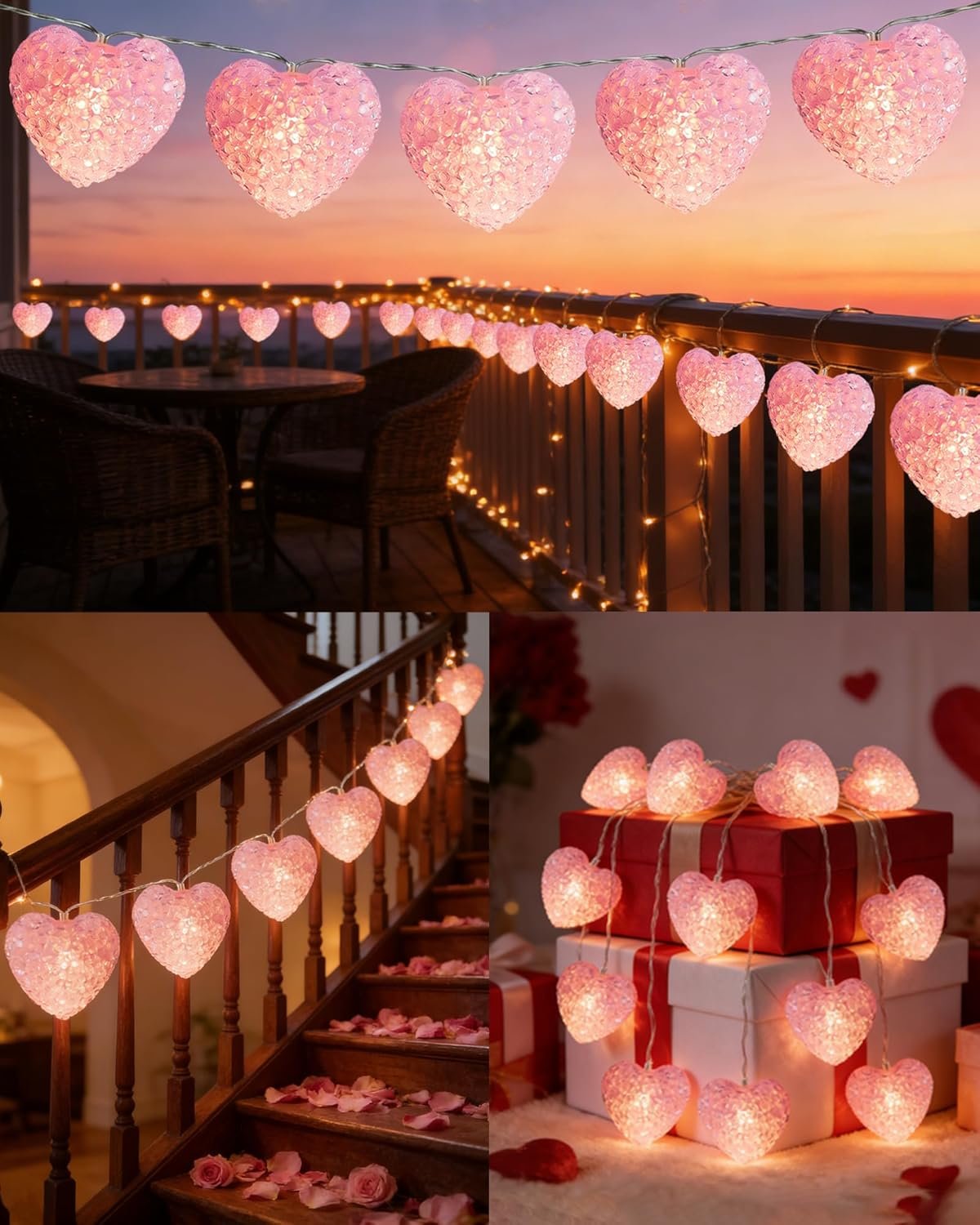 Multi-scene Application Valentines Day Decorations Lights: Heart fairy lights are suitable for indoor and outdoor use, suitable for mantelpiece, window, garden, terrace, fireplace, bedside, balcony, courtyard, Christmas decoration, at marriage proposal site, anniversary, Valentines day decor and other holiday decorations. Heart shaped lights are the best choice whether it is to create a warm corner or to create a party atmosphere