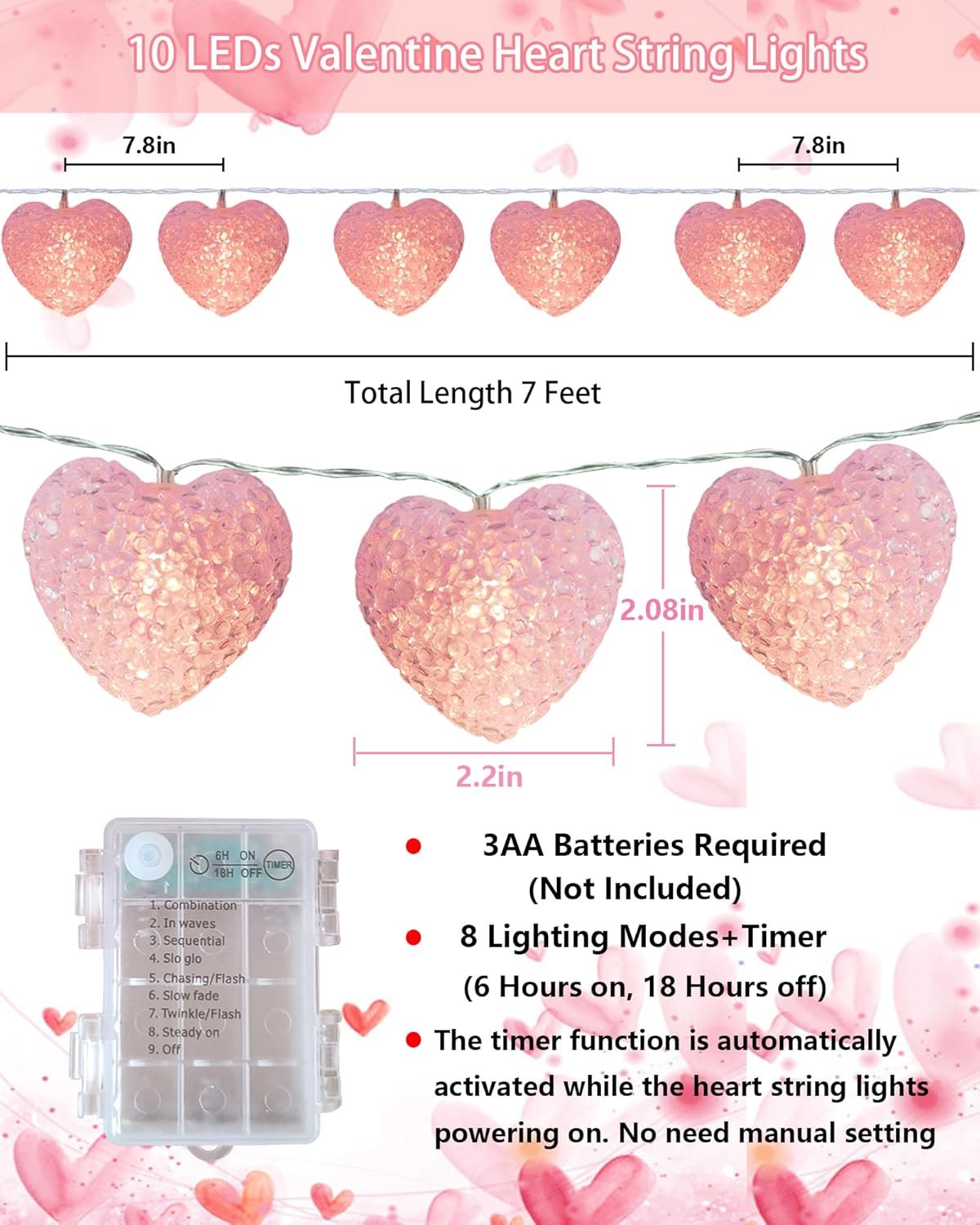 Valentines Day String Lights with Timer Function: Heart light built-in timer allows automatic cycling once the lights turn on (6 hours on, 18 hours off), eliminating the need for manual on/off. Valentine lights indoor can save battery power and extend the use time