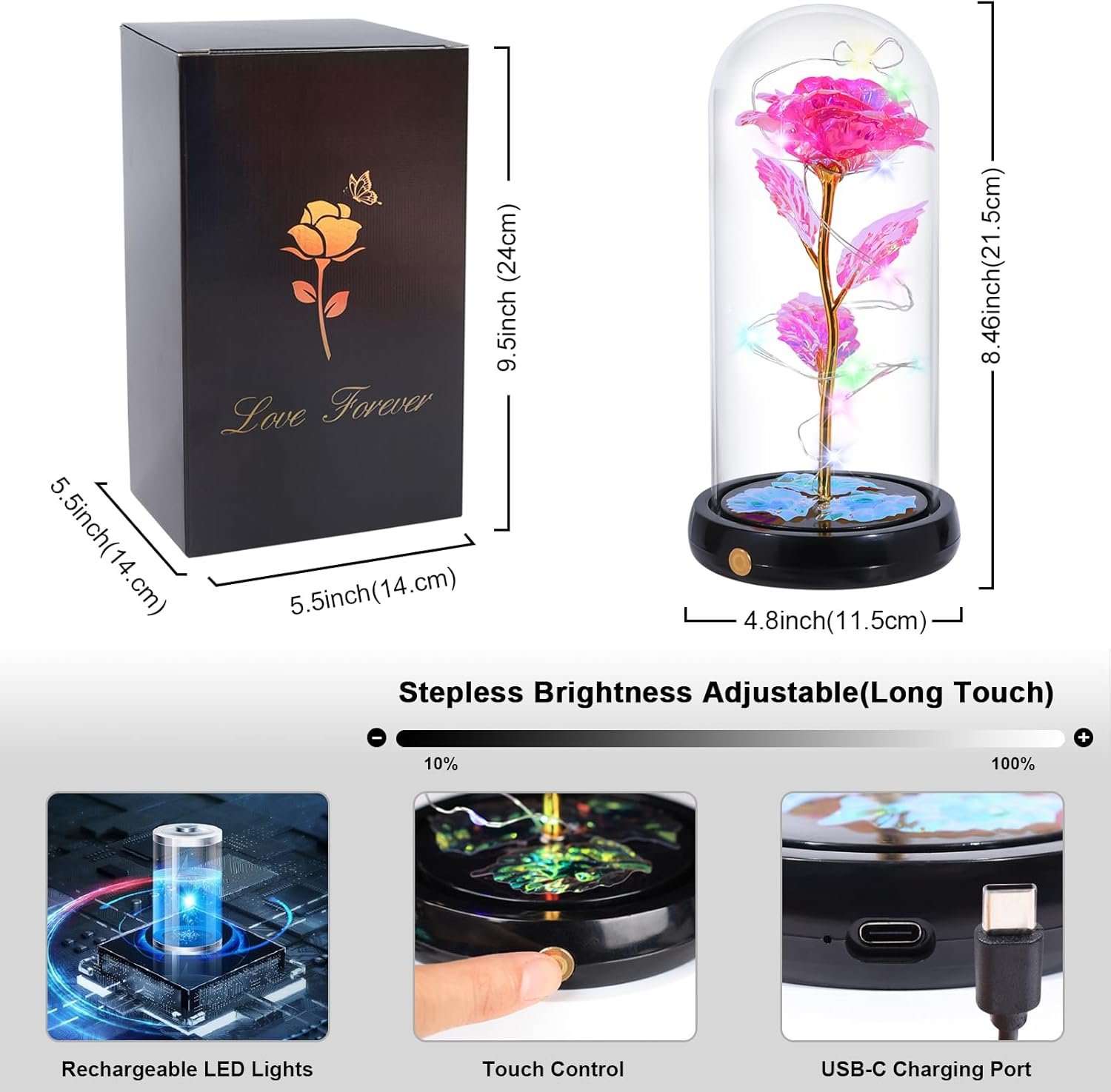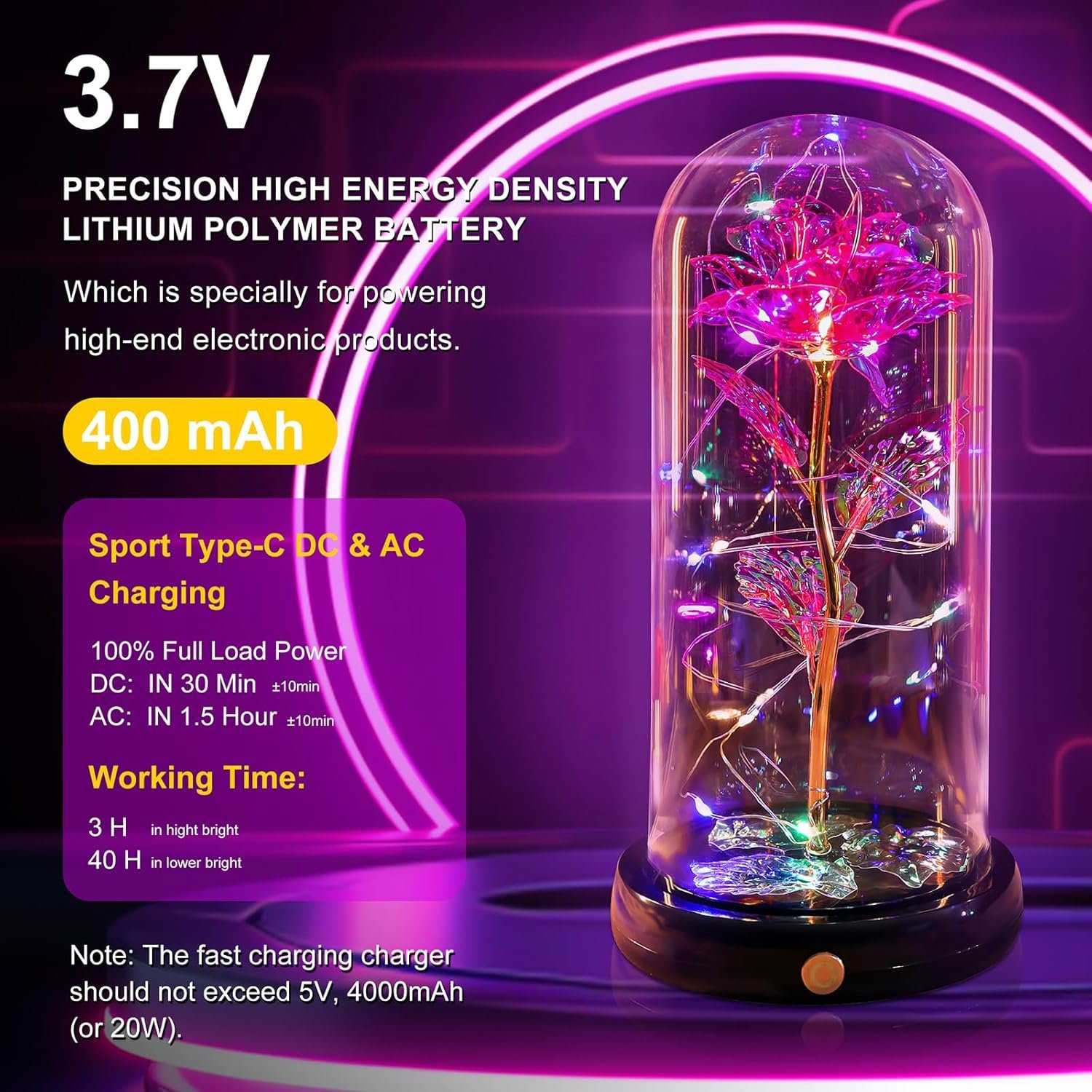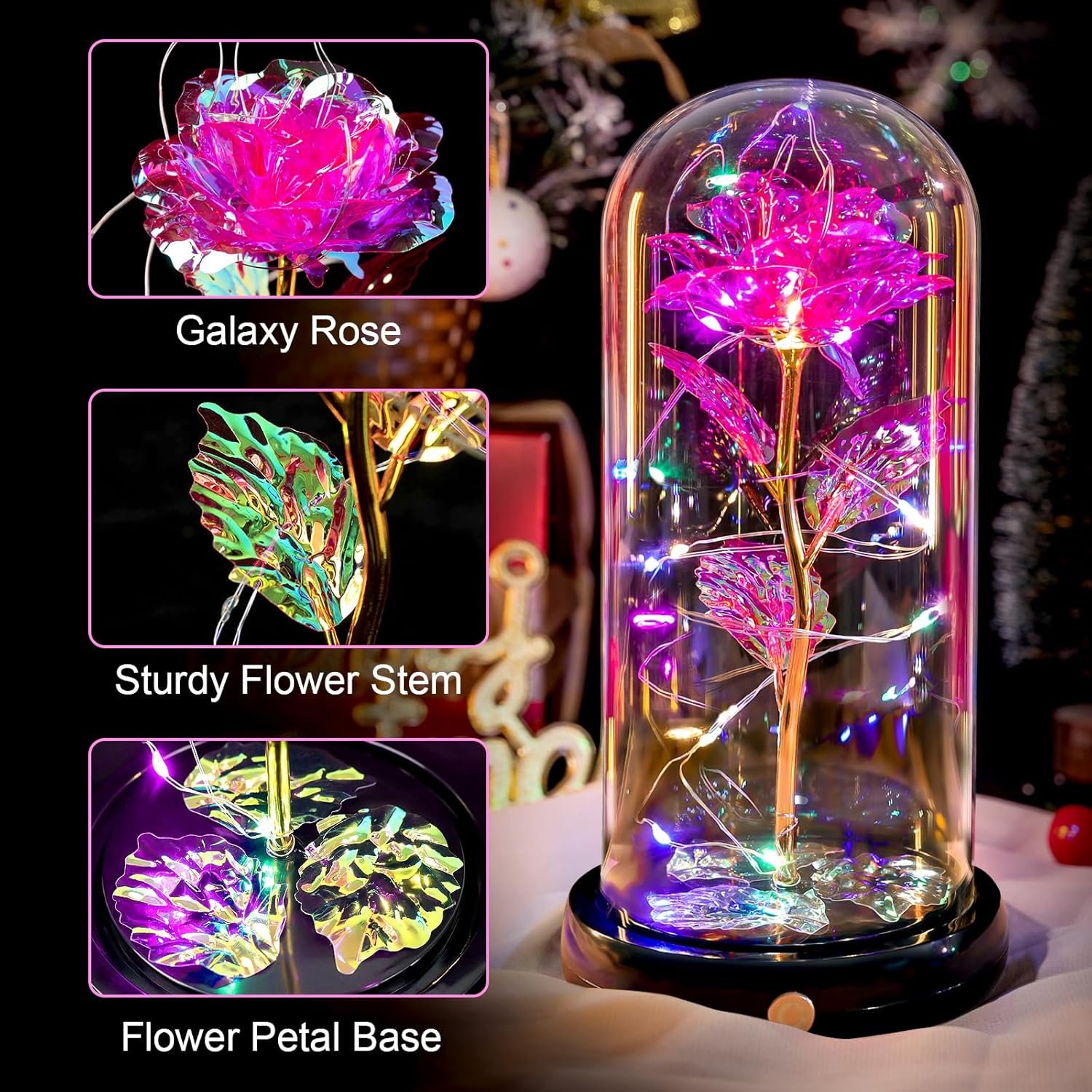 Romantic Valentines Day Gifts for Her: Forever Glass Rose with Colorful Petal Base: Plated with a 3″ extra-large rainbow galaxy rose, 3 rainbow petals on a black plastic base. The glitter glass rose is wrapped around an LED Strip tree lamp, Powered by a built-in rechargeable battery, no need for battery replacement. Simply touch the gold button on the base, and it will glow warm light that can make your mom, wife or girlfriend’s heart feel pleasure