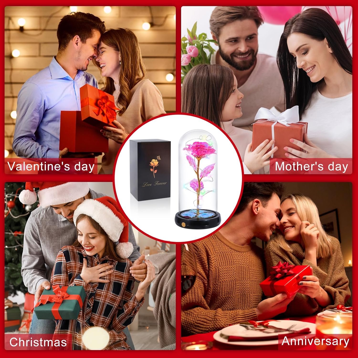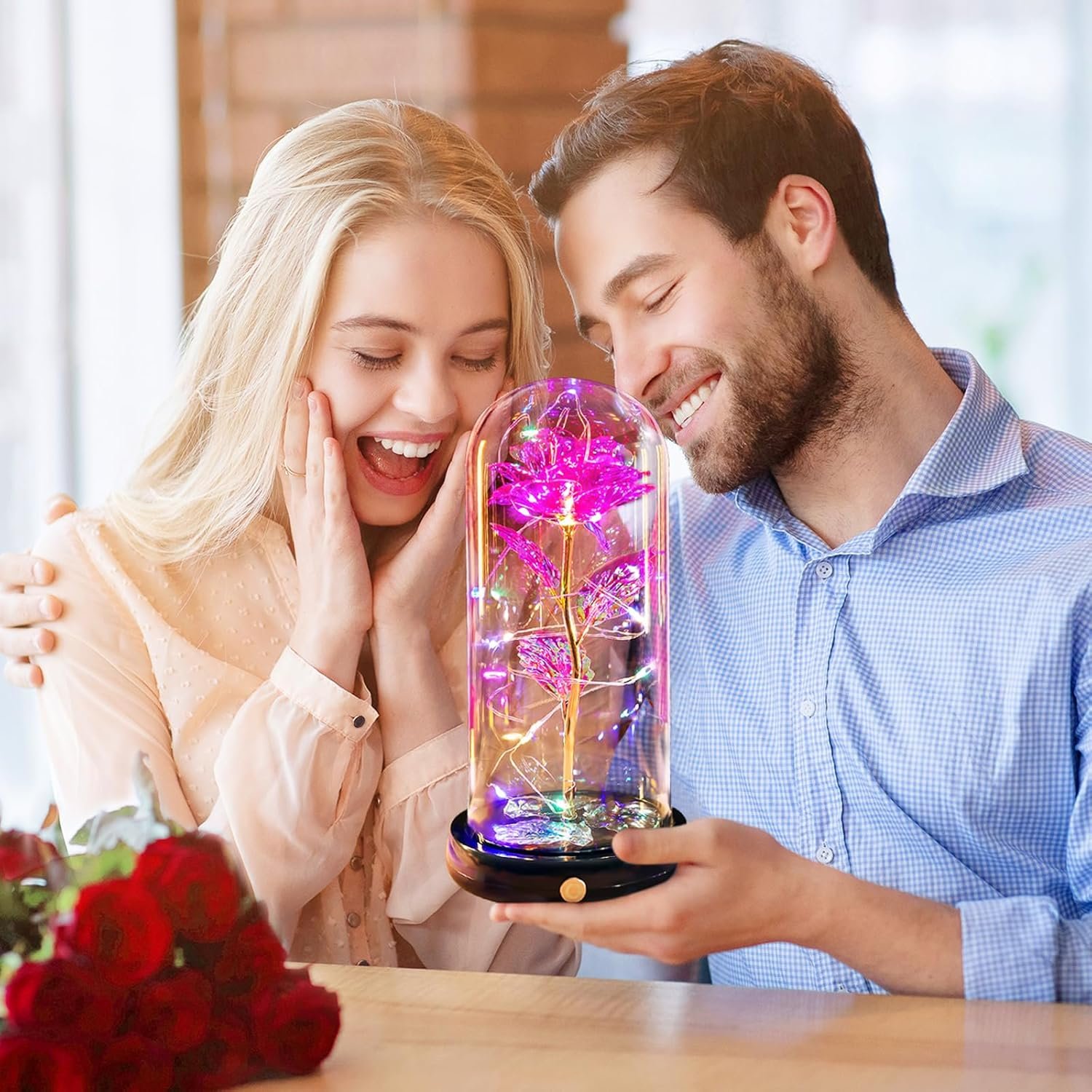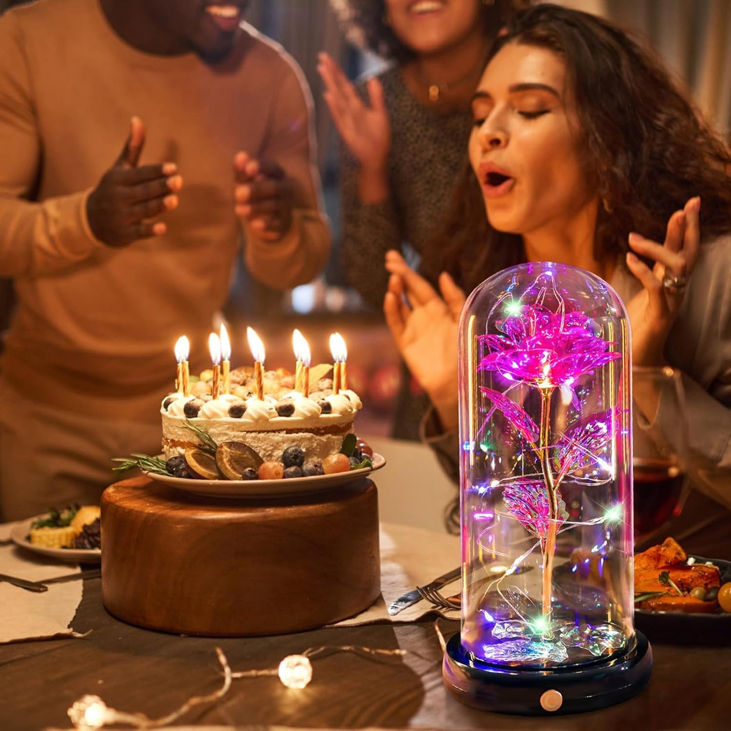 Romantic Valentines Day Gifts for Her: Forever Glass Rose with Colorful Petal Base: Plated with a 3″ extra-large rainbow galaxy rose, 3 rainbow petals on a black plastic base. The glitter glass rose is wrapped around an LED Strip tree lamp, Powered by a built-in rechargeable battery, no need for battery replacement. Simply touch the gold button on the base, and it will glow warm light that can make your mom, wife or girlfriend’s heart feel pleasure