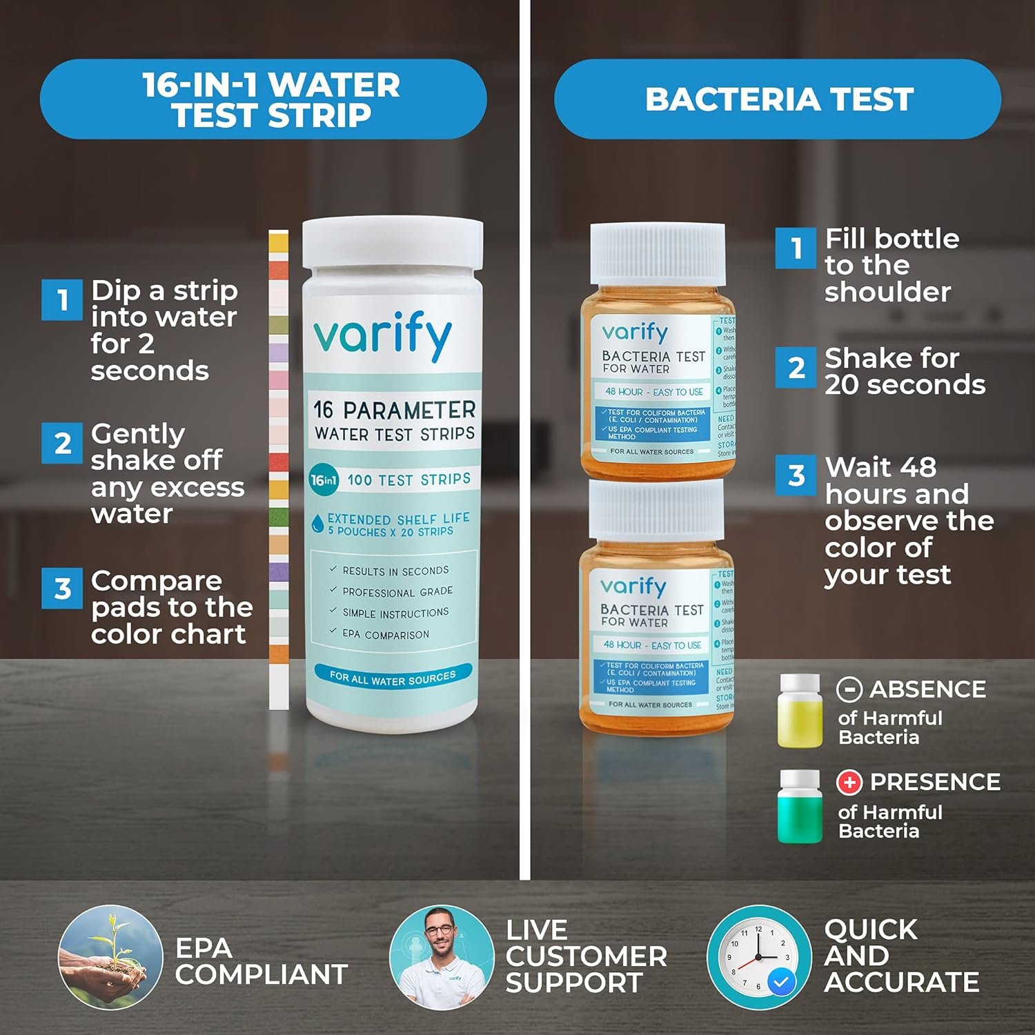 EASY TO USE: Varify’s water test strips and Bacteria Test kits feature a user-friendly, color-coded system for quick and precise water quality assessments. With clear color changes indicating various parameters, these strips make complex data easily understandable, ensuring you can evaluate your water’s safety effortlessly in just minutes.