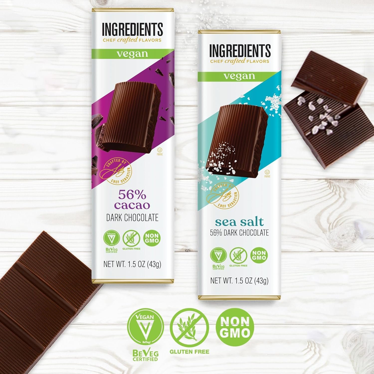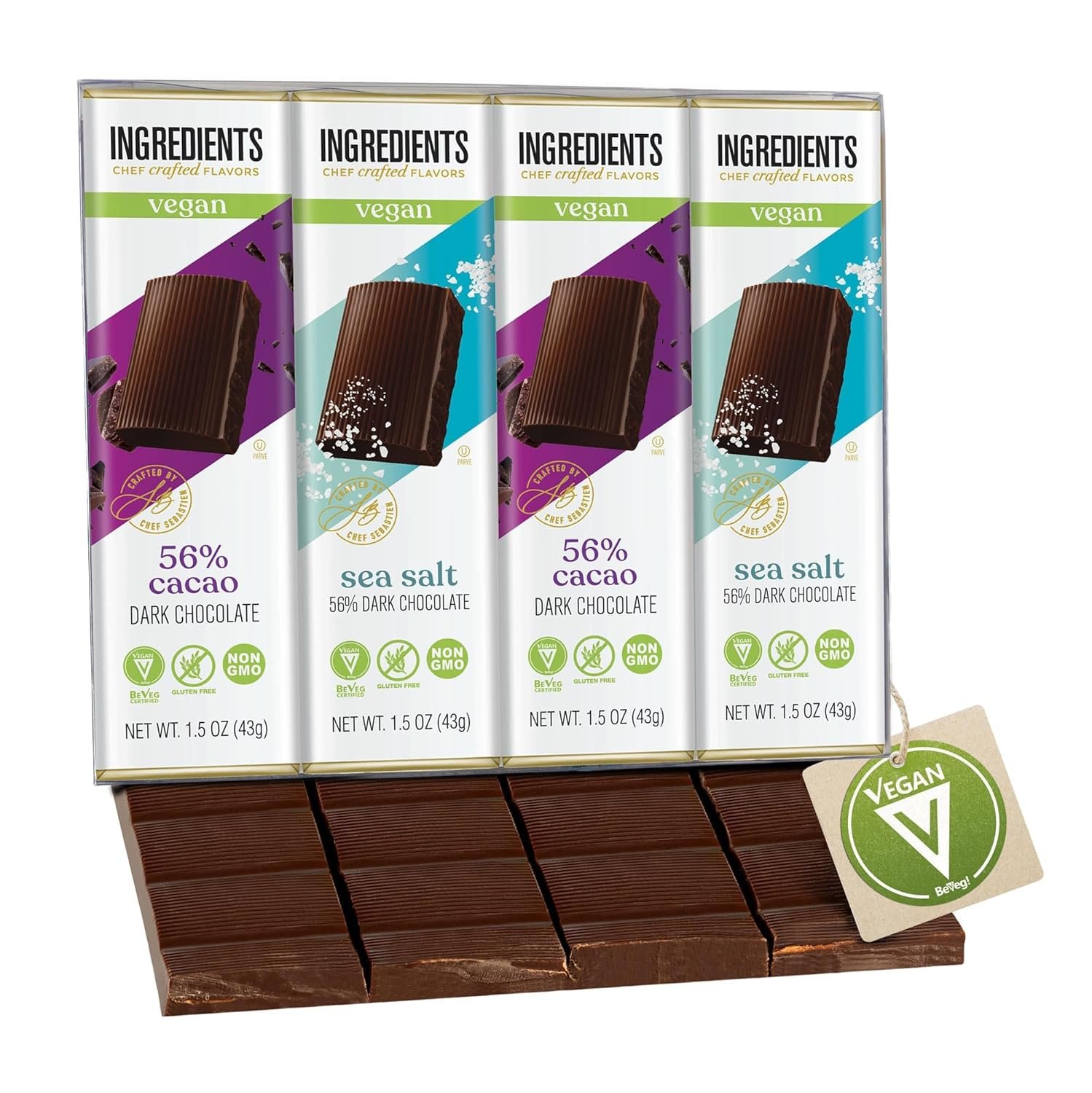 YES THEY’RE BEVEG INTERNATIONAL VEGAN CERTIFIED: These delicious vegan chocolate bars are made with a rich dark chocolate. All the deliciousness with no cream so they are vegan certified – good for the planet, good for you! Two flavors, Dark & Dark Sea Salt – Individually wrapped in an acetate pack creating a great gift!