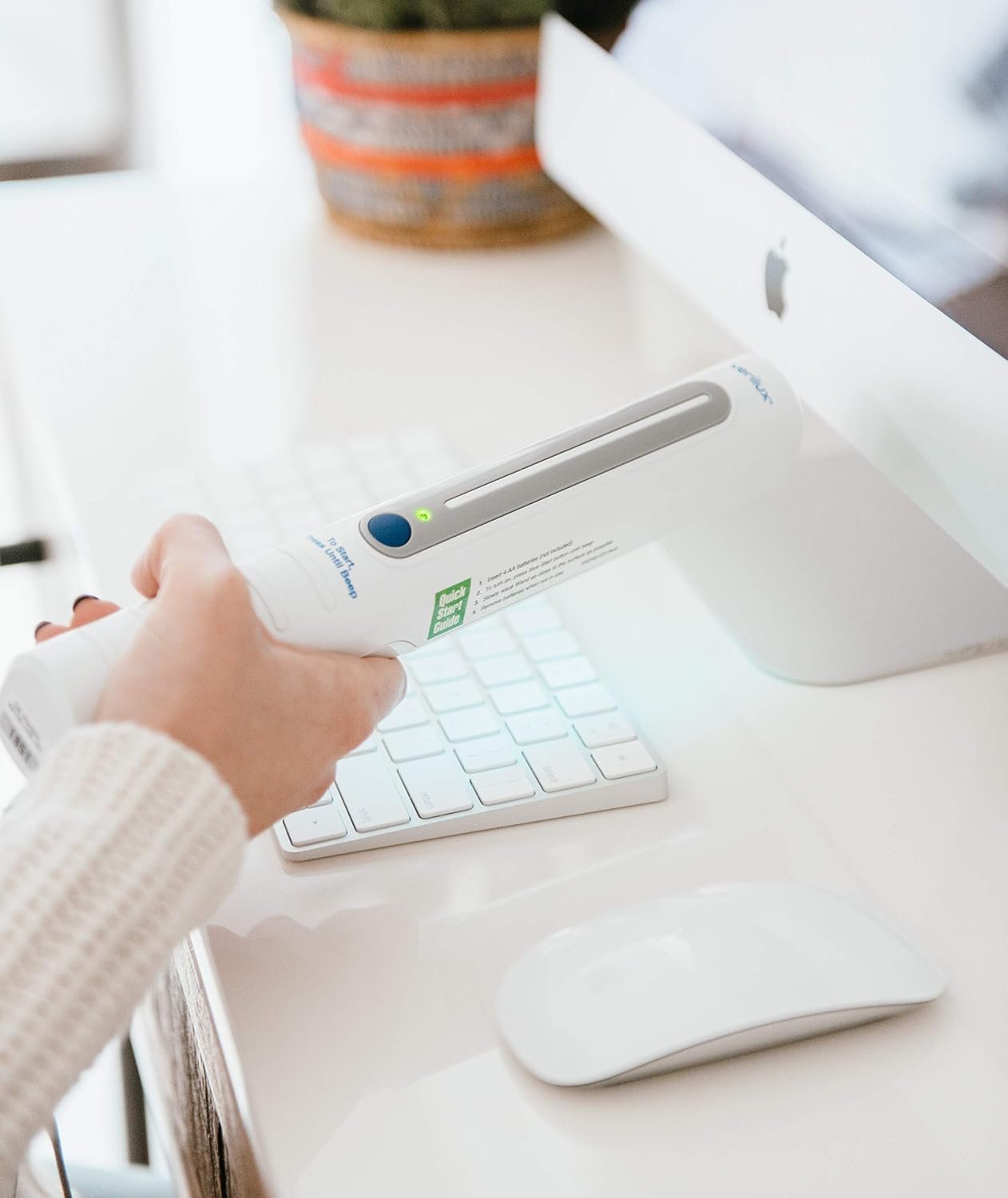 Keep your CleanWave facing down and press the blue button for 3 seconds. A green light will flash and you are ready to start using it!