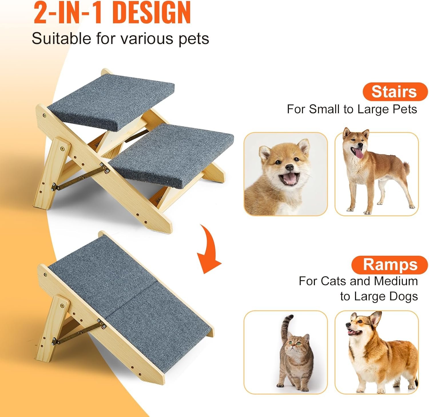 2-in-1 Design: This foldable wooden dog stair features a 2-step design, perfect for small dogs, elderly pets, or those with mobility issues to access beds, sofas, cars, and more. It can also be quickly converted into a ramp, which is better suited for cats or medium to large dogs to climb and walk on due to its steeper incline.