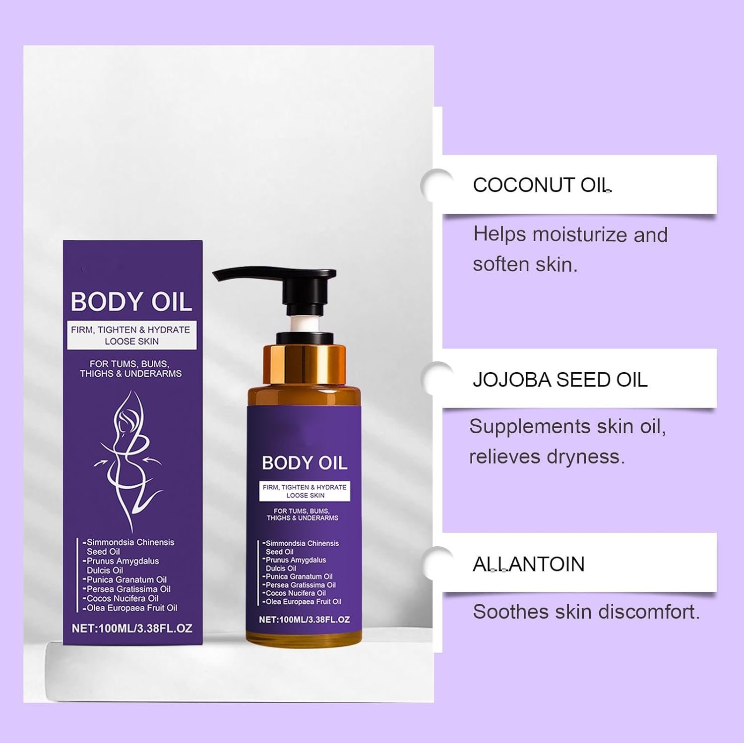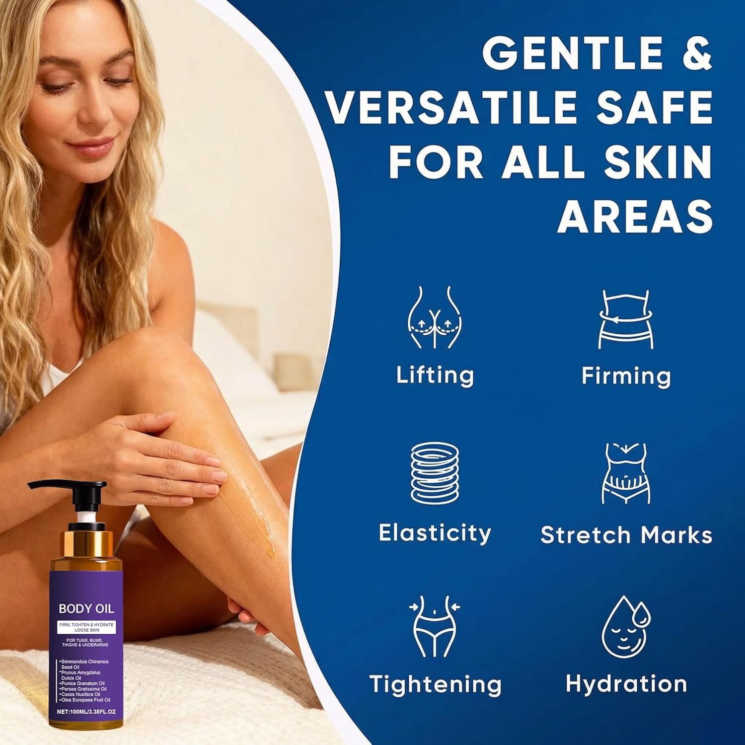 【Firming & Lifting】Body oil made from Simmondsia Chinensis Seed Oil, Prunus Amygdalus Dulcis Oil, Persea Gratissima Oil, Cocos Nucifera Oil, Olea Europaea Fruit Oil 5 cold-pressed natural oils. skin tightening body oil is ideal for improve skin laxity and enhance elasticity through daily care