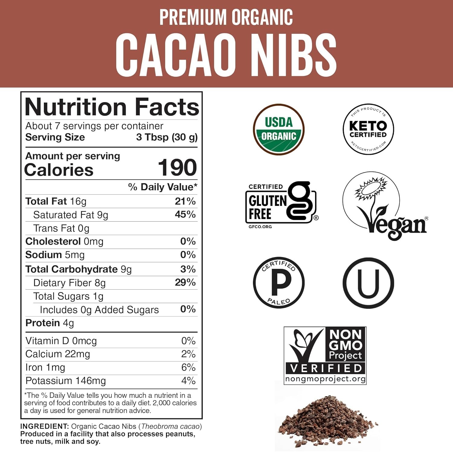 ✔️ QUALITY YOU CAN TRUST – Our Cacao Nibs are Non-GMO, Kosher, Certified Organic, Gluten-Free, Vegan, Paleo and Keto. Note: Since they come from crushed cacao beans, your pouch may contain a few stems and bits of hard shells – If found, please discard.