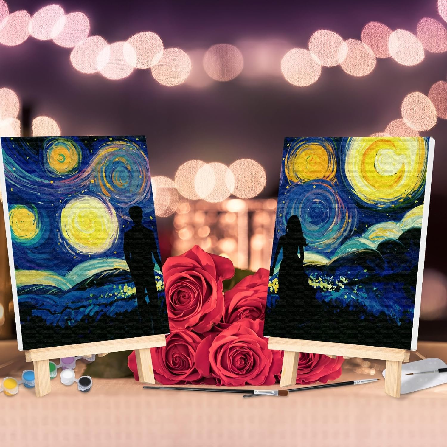 [Everything You Need] VOCHIC painting kit includes 2 packs of 8x10in pre-sketched canvas, 2 black aprons, 2 tabletop easels, 16pcs(8×2) acrylic colors, 6pcs(3×2) paint brushes, 2 pallets, and 2 sample images,2 candle,1 tablecloth.
