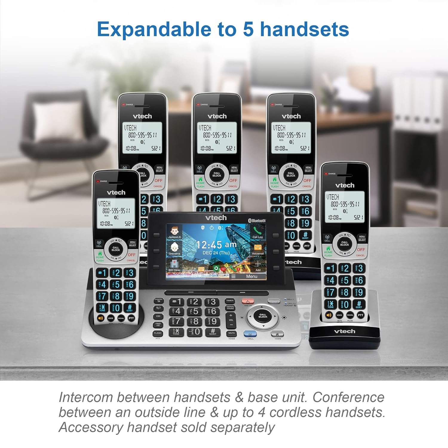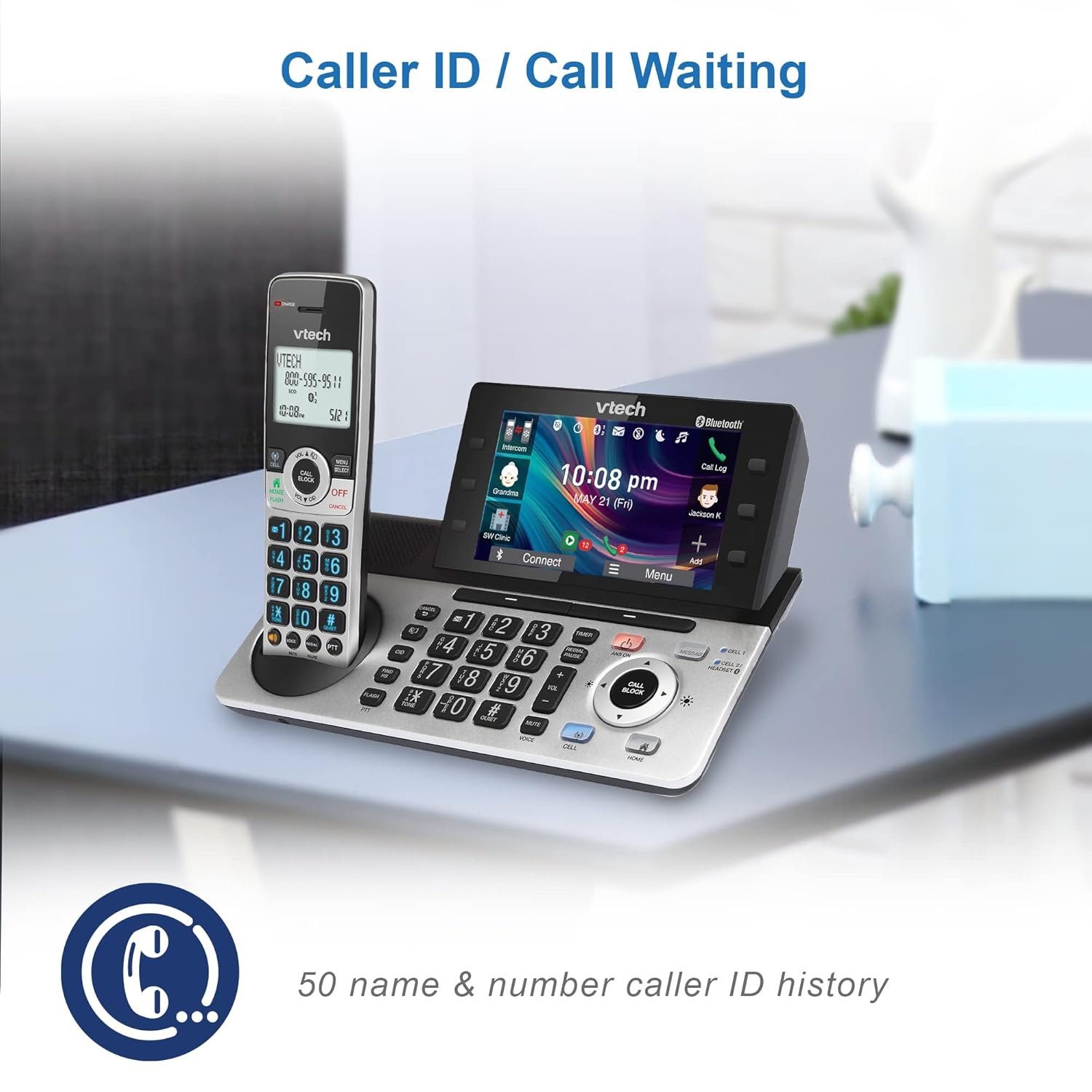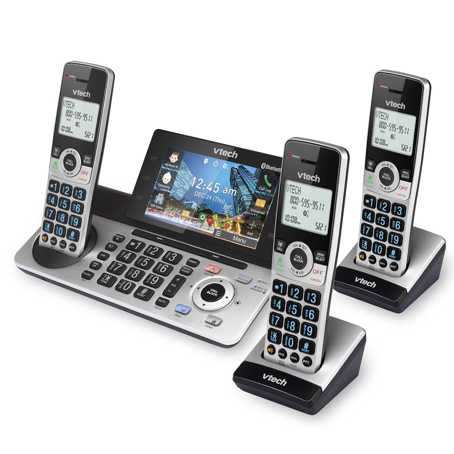 With the VTech IS8251-3 3-Handset Expandable Cordless Phone featuring the industry’s largest 5″ color base display, managing your communication has never been easier. Assign shortcuts on the large disply for quick access to features that are important to you and easily view all the releveant information from messages left on the answering system. With and Smart Call Blocker, you won’t have to worry about unwanted calls waking you up in the middle of the night or tying up the line. Robocalls are automatically blocked from ever ringing through—even the first time. You can also permanently blacklist any number you want with one touch. Bluetooth Connect to Cell technology on this cordless phone system lets you receive cell and/or landline calls from one home phone system. With a touch of a button, enjoy the high-tech benefits your smart phone offers. Even if your smart phone is in a different room, you can still access Siri or Google Now from the cordless handsets. Place a call, write or read a text and perform all the other actions these services offer.