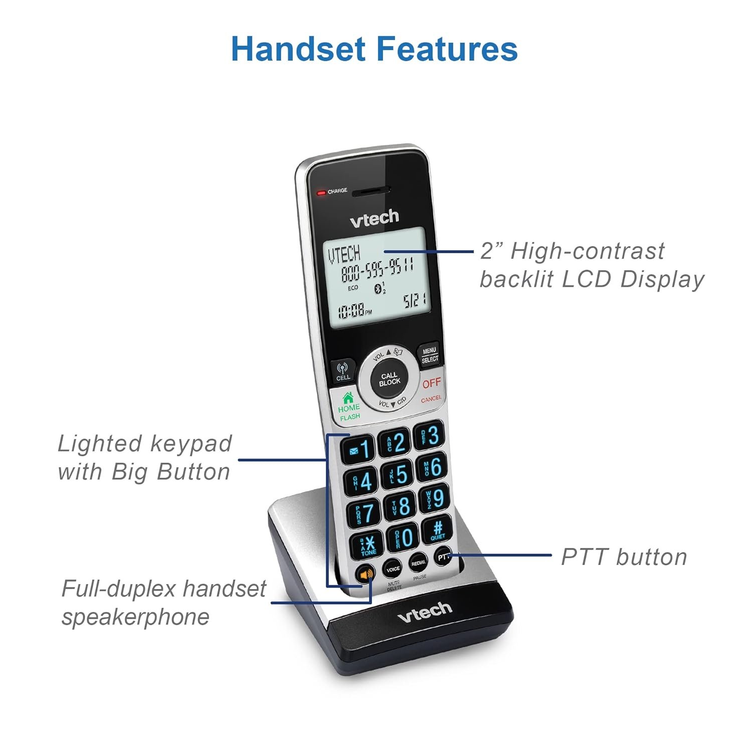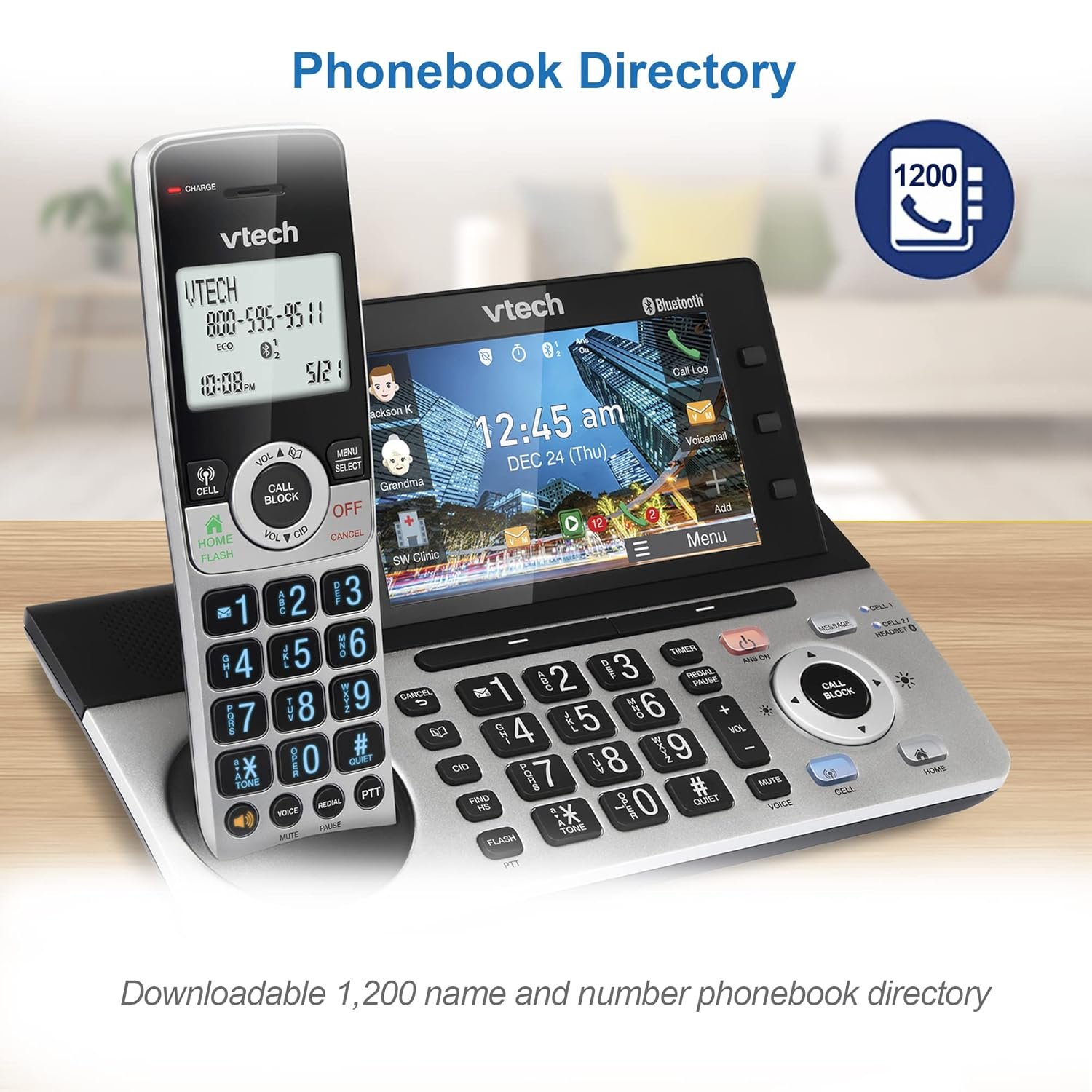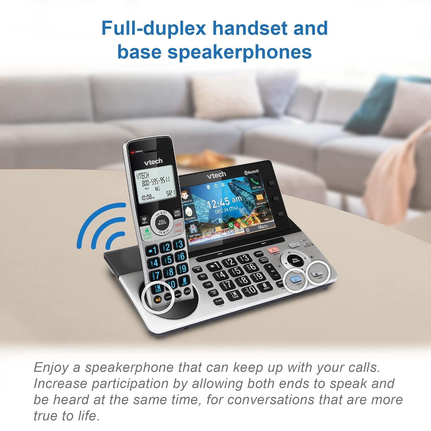 With the VTech IS8251-3 3-Handset Expandable Cordless Phone featuring the industry’s largest 5″ color base display, managing your communication has never been easier. Assign shortcuts on the large disply for quick access to features that are important to you and easily view all the releveant information from messages left on the answering system. With and Smart Call Blocker, you won’t have to worry about unwanted calls waking you up in the middle of the night or tying up the line. Robocalls are automatically blocked from ever ringing through—even the first time. You can also permanently blacklist any number you want with one touch. Bluetooth Connect to Cell technology on this cordless phone system lets you receive cell and/or landline calls from one home phone system. With a touch of a button, enjoy the high-tech benefits your smart phone offers. Even if your smart phone is in a different room, you can still access Siri or Google Now from the cordless handsets. Place a call, write or read a text and perform all the other actions these services offer.