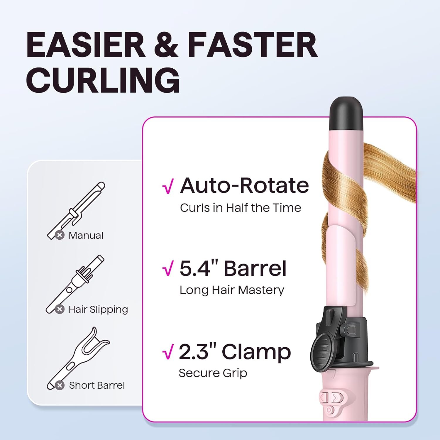 A Time-Saver for Beachy Waves: The Wavytalk Curl Cycle Rotating Curling Iron swiftly creates beautiful, lasting beachy waves. With a quick press of the arrow button, the auto-rotation effortlessly curls hair on both sides, giving salon-perfect results in less time
